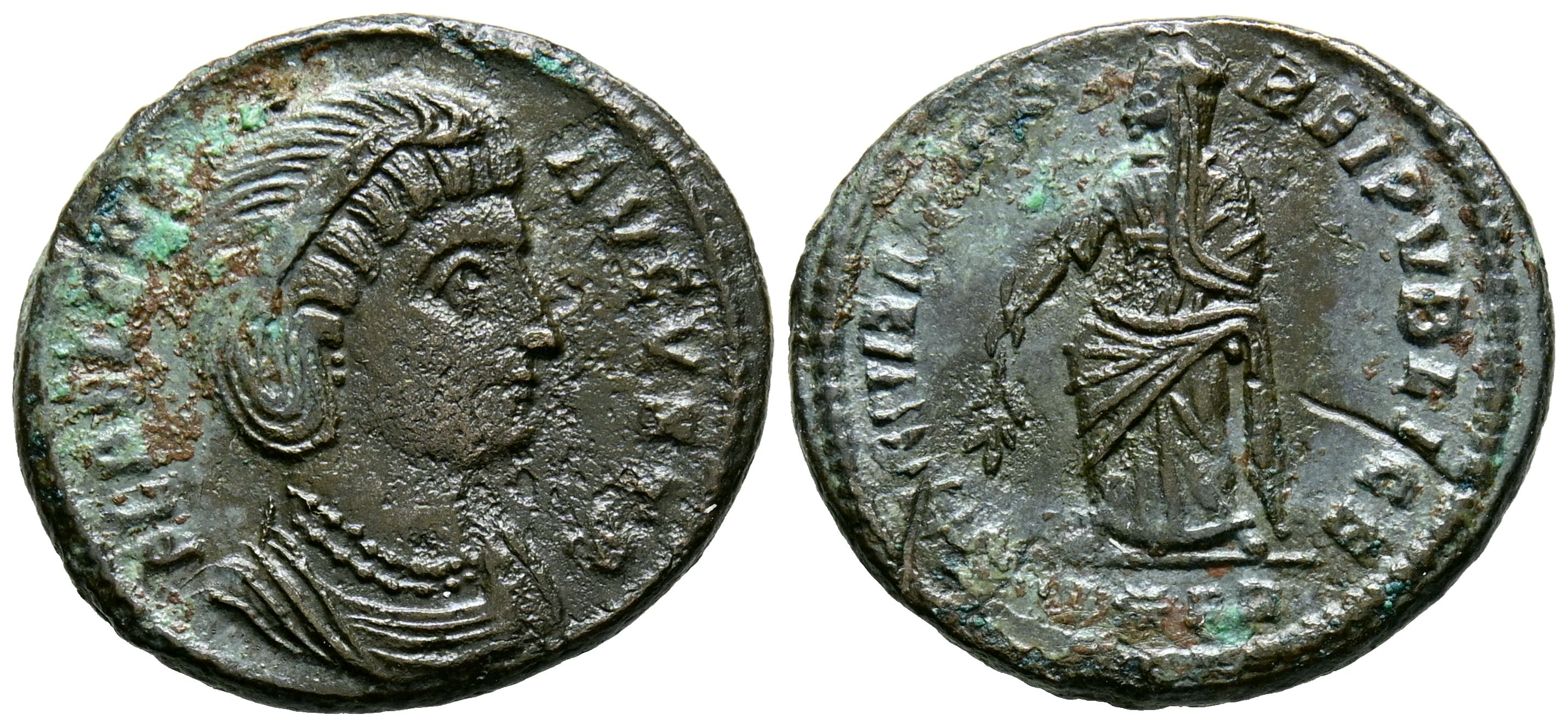 HELENA. Follis. (Ae. 3,07g/20mm). 326-327 d.C. Arles. (RIC 278). Anv: Busto drapeado de Helena a derecha, alrededor leyenda: FL HELENA AVGVSTA. Rev: Securitas estante a izquierda, sosteniendo una rama de olivo, en exergo: T*AR, alrededor leyenda: SECVRITAS REI PVBLICE. MBC. Oxidaciones.