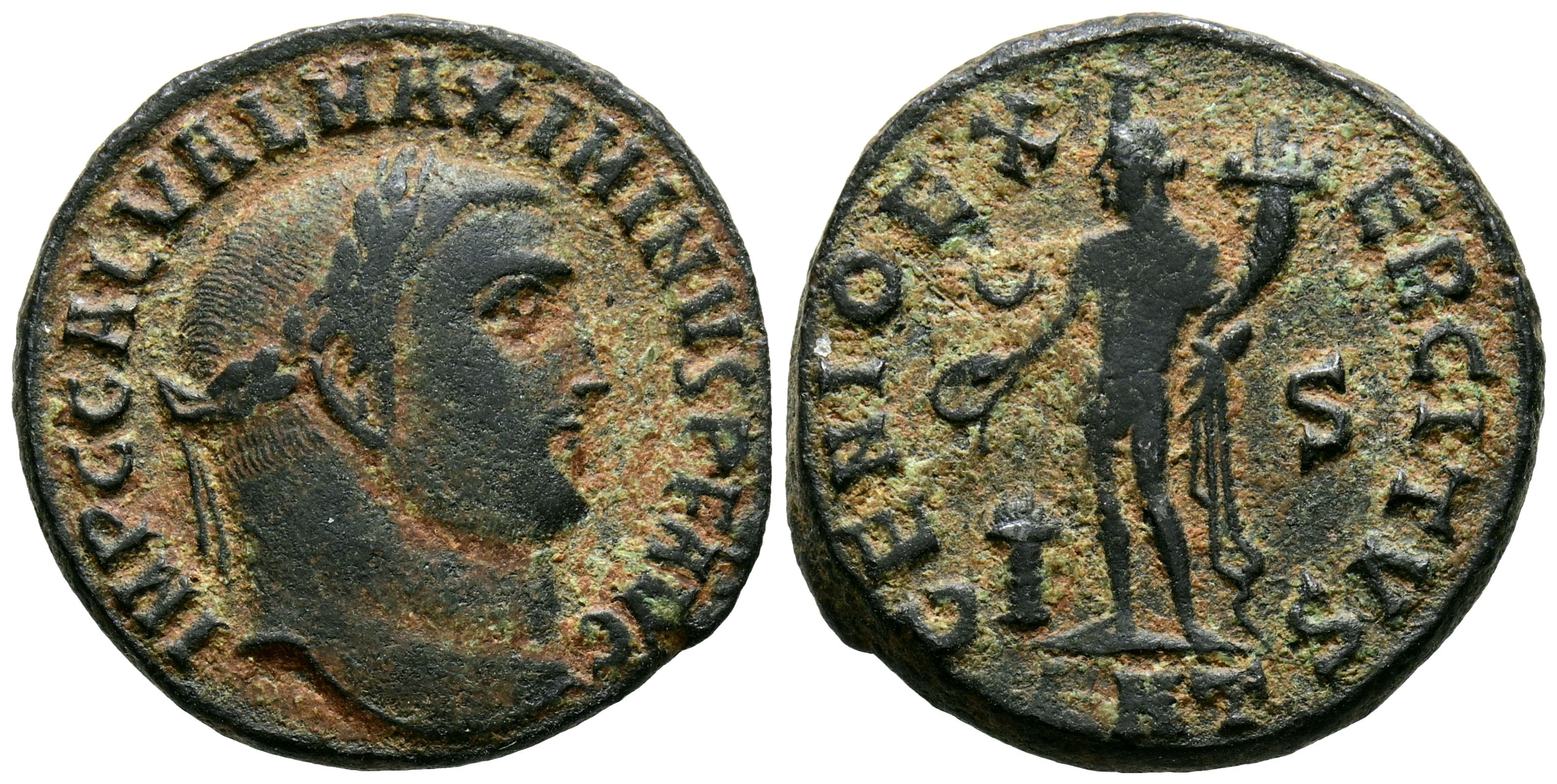 MAXIMINO II. Follis. (A. 6,52g/22mm). 310-311 d.C. Antioquía. (RIC 133c). Anv: Busto laureado de Maximino II a derecha, alrededor leyenda: IMP C GAL VAL MAXIMINVS P F AVG. Rev: Genio estante a izquierda portando globo sobre altar y cornucopia, en campo creciente y S, en exergo: ANT, alrededor leyenda: GENIO EXERCITVS. MBC.