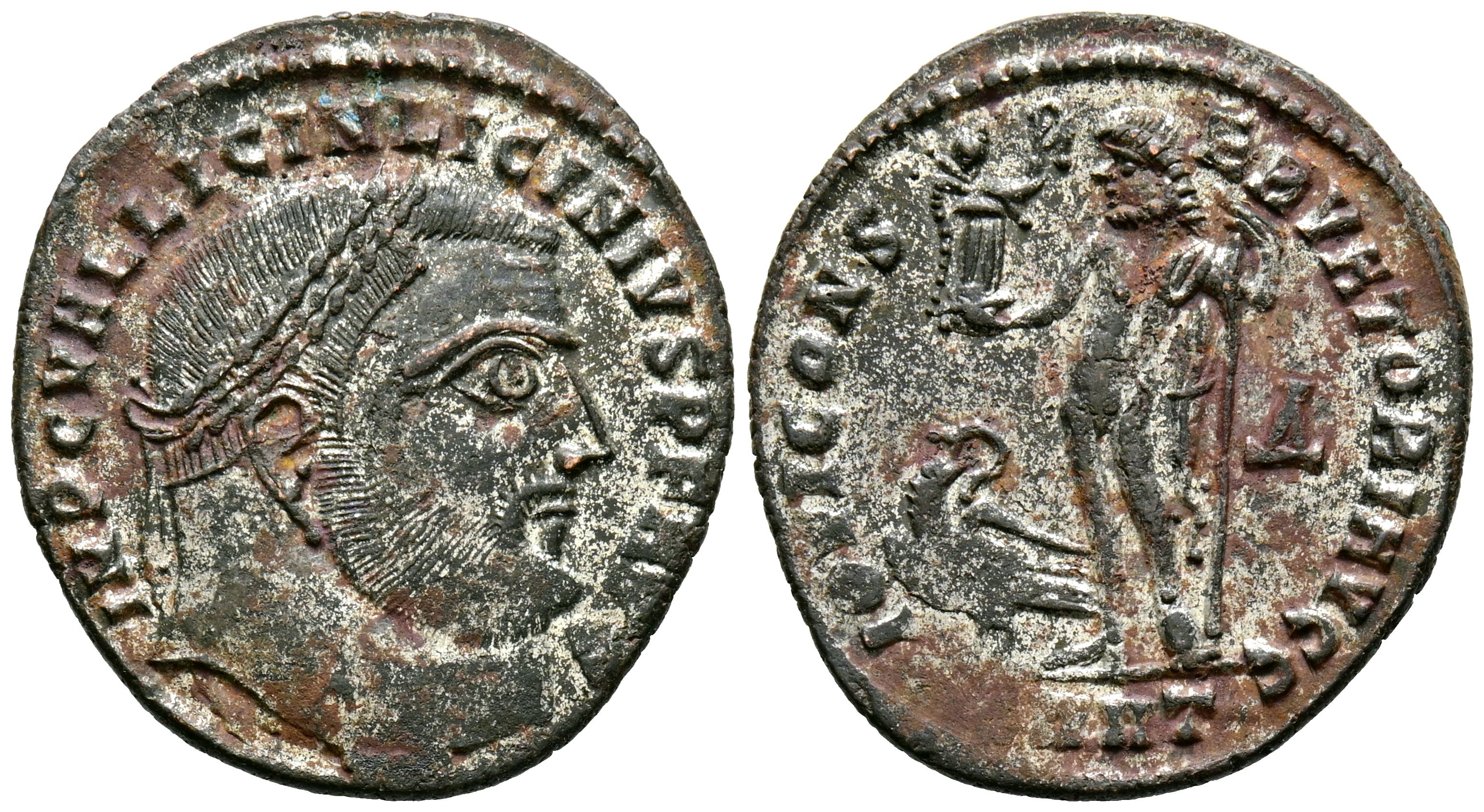 LICINIO I. Follis. (Ae. 3,99g/24mm). 313 d.C. Heráclea. (RIC 73). Anv: Cabeza laureada de Licinio I a derecha, alrededor leyenda: IMP C VAL LICIN LICINIVS P F AVG. Rev: Júpiter estante a izquierda portando lanza y Victoria con corona de laurel a sus pies águila con corona de laurel, en campo: A, en exergo: SMHT, alrededor leyenda: IOVI CONSERVATORI AVGG. MBC. Restos de plateado original.