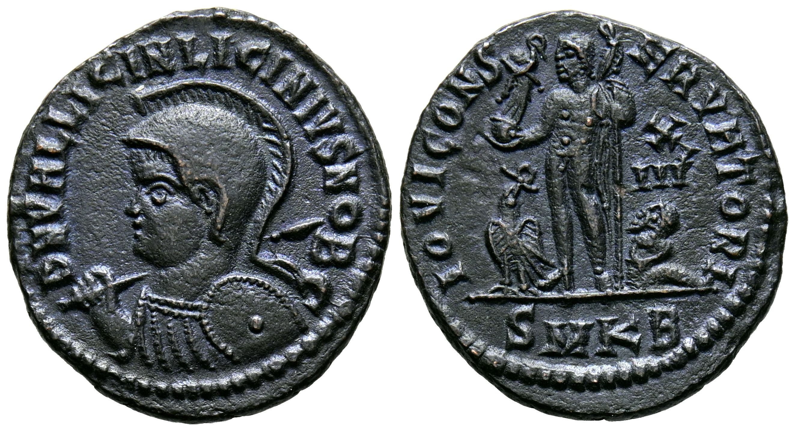 LICINIO II. Follis. (Ae. 2,75g/20mm). 321-324 d.C. Alejandría. (RIC 30). Anv: Busto con casco y coraza de Licinio II a izquierda portando escudo y lanza, alrededor leyenda: D N VAL LICIN LICINIVS NOB C. Rev: Júpiter estante a izquierda portando lanza y Victoria con corona de laurel, a sus pies águila con corona de laurel y cautivo sentado a izquierda, en campo X/III, en exergo: SMKB, alrededor leyenda: IOVI CONSERVATORI. MBC+.