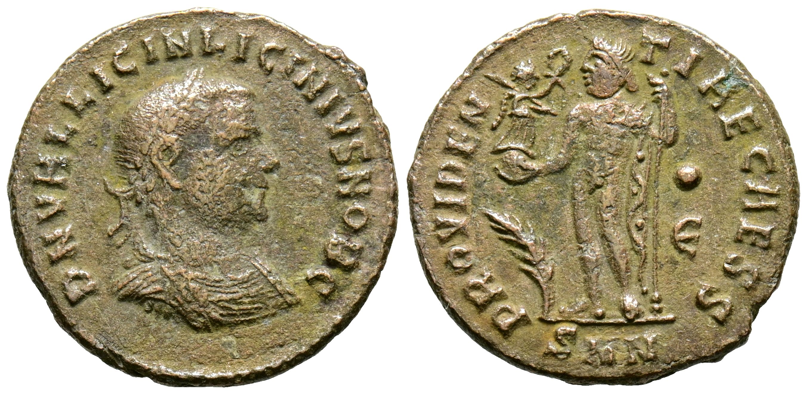 LICINIO II. Follis. (Ae. 2,79g/19mm). 317-320 d.C. Nicomedia. (RIC 34). Anv: Busto laureado, drapeado y acorazado de Licinio II a derecha, alrededor leyenda: D N IVL LICINIVS NOB C. Rev: Júpiter a izquierda, en campo: palma y E, en exergo: SMN, alrededor leyenda: PROVIDENTIAE CAESS. MBC-.