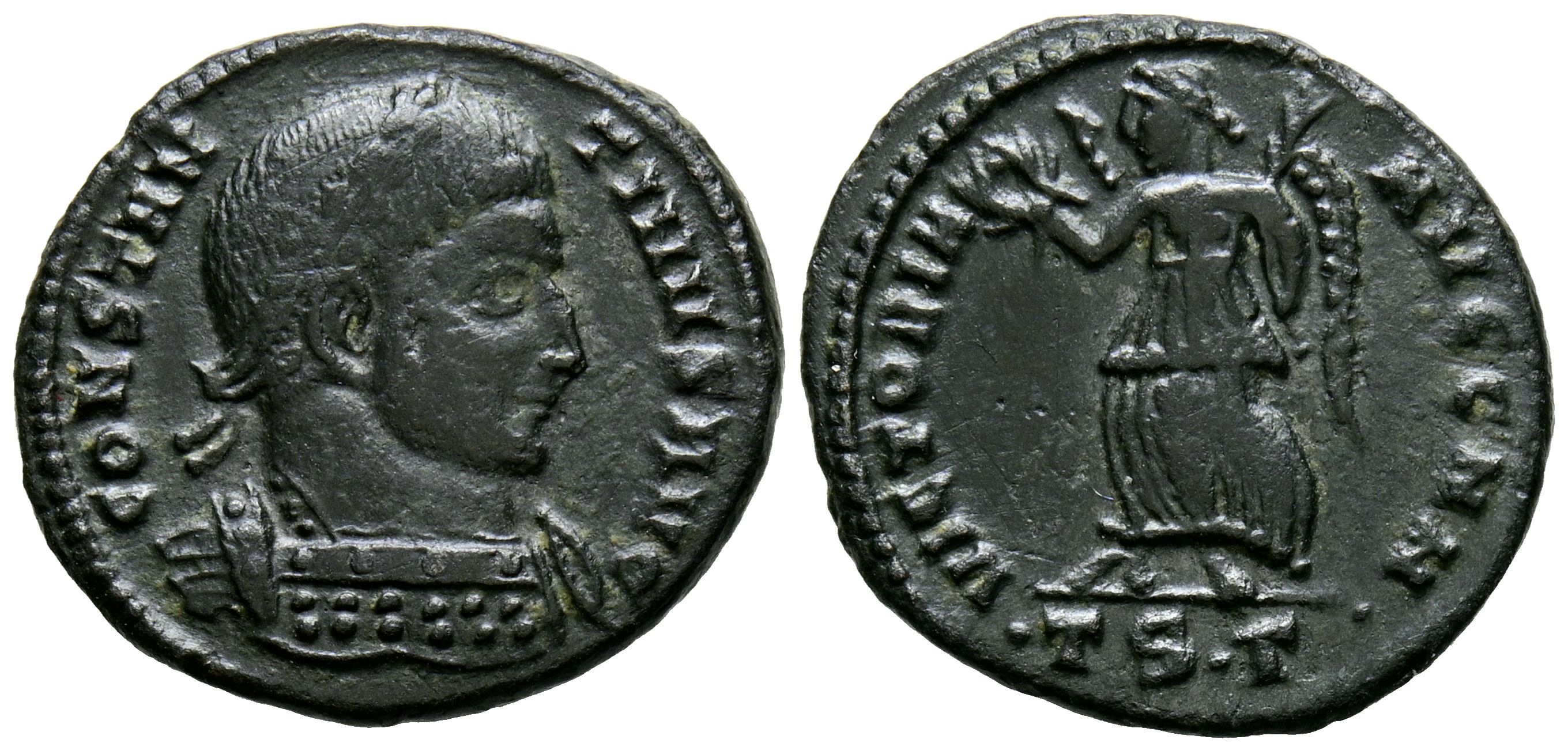 CONSTANTINO I. Follis. (Ae. 3,11g/19mm). 307-337 d.C. Tesalónica. (RIC 59). Anv: Busto laureado y con coraza de Contantino I a derecha, alrededor leyenda: CONSTANTINVS AVG. Rev: Victoria estante a izquierda, en exergo: TSr, alrededor leyenda: VICTORIA AVGG NN. MBC-.