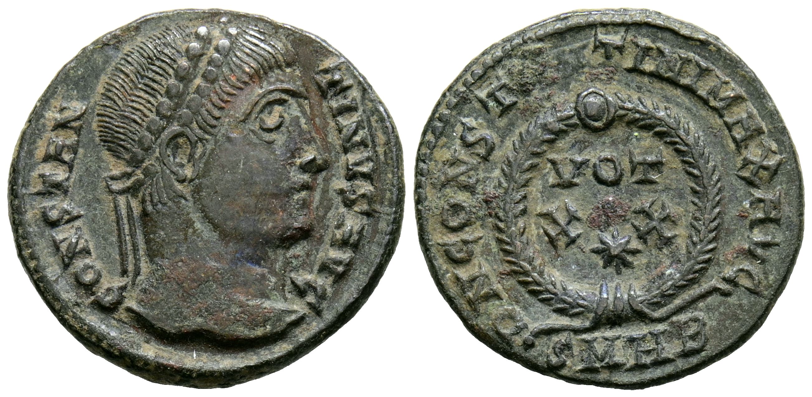 CONSTANTINO I. Follis. (Ae. 2,75g/18mm). 324 d.C. Heraclea. (RIC 64). Anv: Cabeza laureada de Constantino I a derecha, alrededor leyenda: CONSTANTINVS AVG. Rev: Leyenda: VOT/XX, debajo estrella, dentro de corona de laurel, debajo: SMHB, alrededor leyenda: DN CONSTANTINI MAX AVG. MBC.
