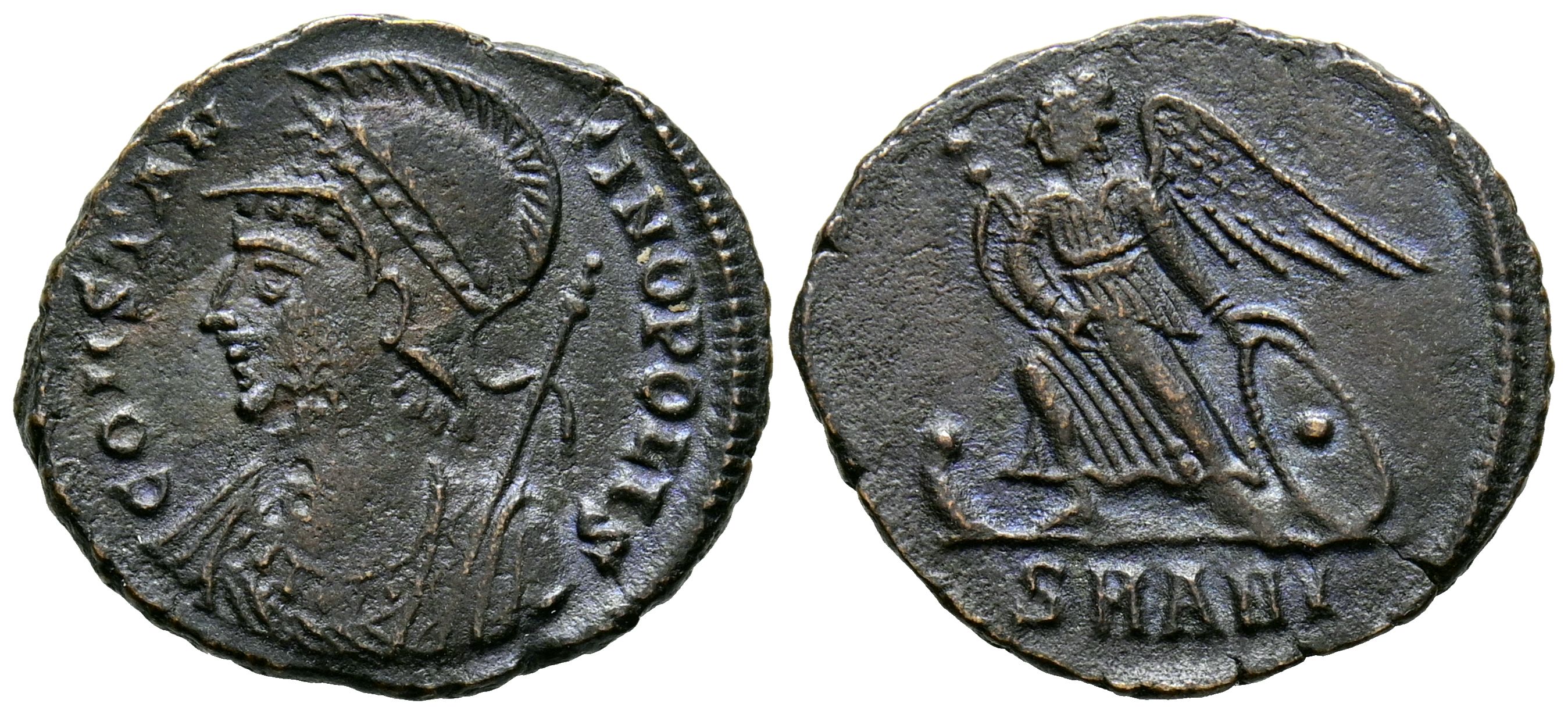 CONSTANTINO I. Follis. (Ae. 2,62g/18mm). 335 d.C. Antioquía. (RIC 92). Anv: Busto de Constantinopolis a izquierda con casco y coraza, portando cetro, alrededor leyenda: CONSTANTINOPOLIS. Rev: Victoria con cetro y escudo sobre proa a izquierda, en exergo: SMANI. MBC.