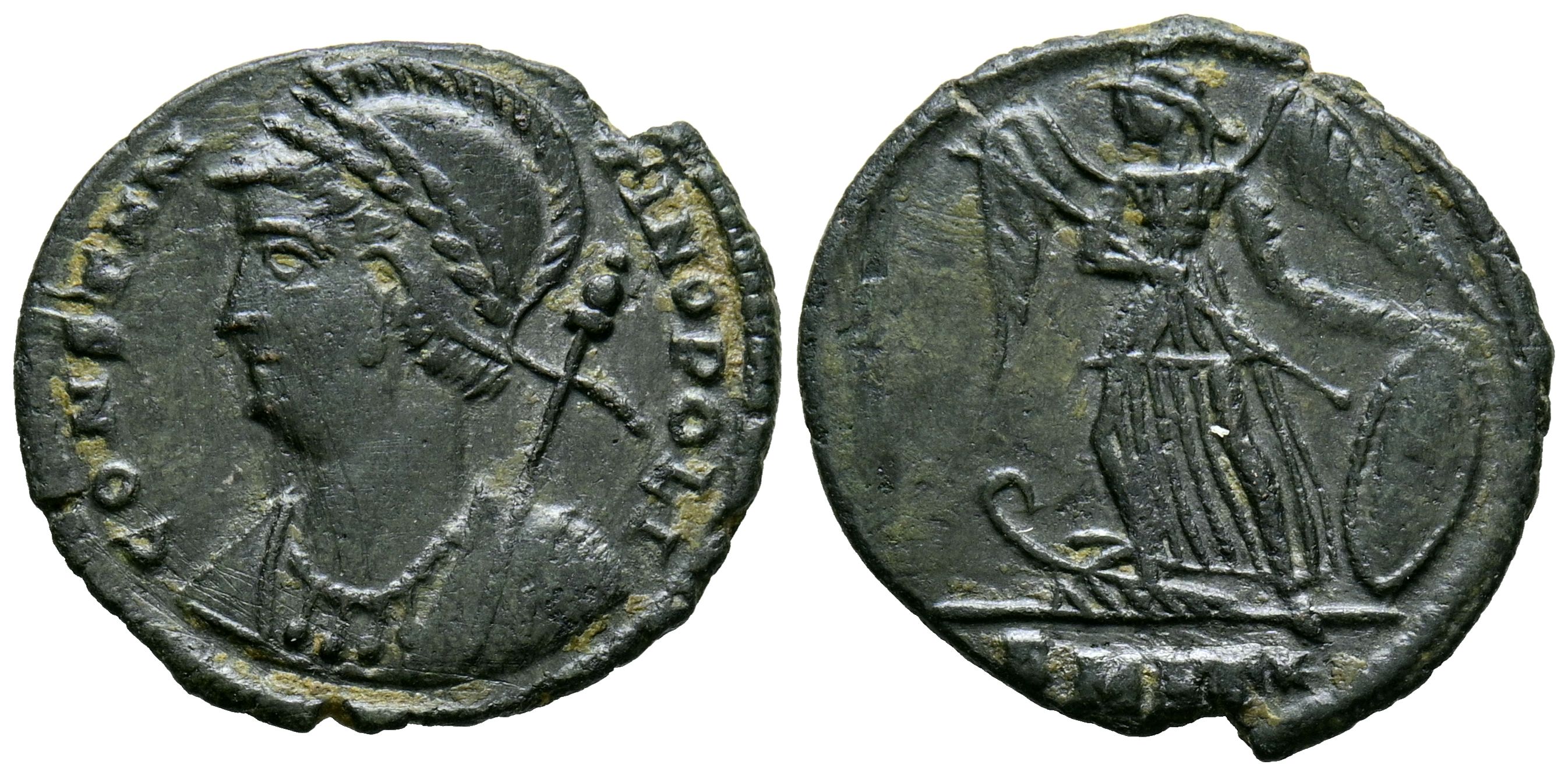 CONSTANTINO I, Series conmemorativas. Follis. (Ae. 1,88g/19mm). 330-354 d.C. Cícico. (RIC 135). Anv: Busto con casco y coraza de Constantinopla a izquierda portando cetro, arlededor leyenda: CONSTANTINOPOLI. Rev: Victoria avanzando a izquierda sobre proa portando escudo y cetro, en exergo: SMKE. MBC. Limpiado.