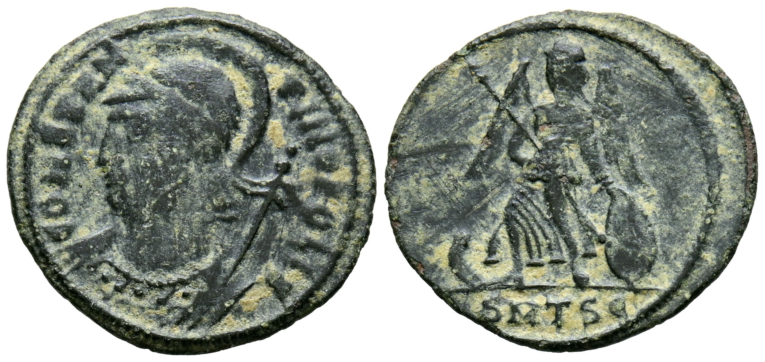 CONSTANTINO I. Follis. (Ae. 1,40g/18mm). 335 d.C. Tesalonica. (RIC 188). Anv: Busto de Constantinopolis a izquierda con casco y coraza, con cetro a su espalda, alrededor leyenda: CONSTANTINOPOLIS. Rev: Victoria con cetro y escudo sobre proa a izquierda, en exergo: SMTSE. MBC-.