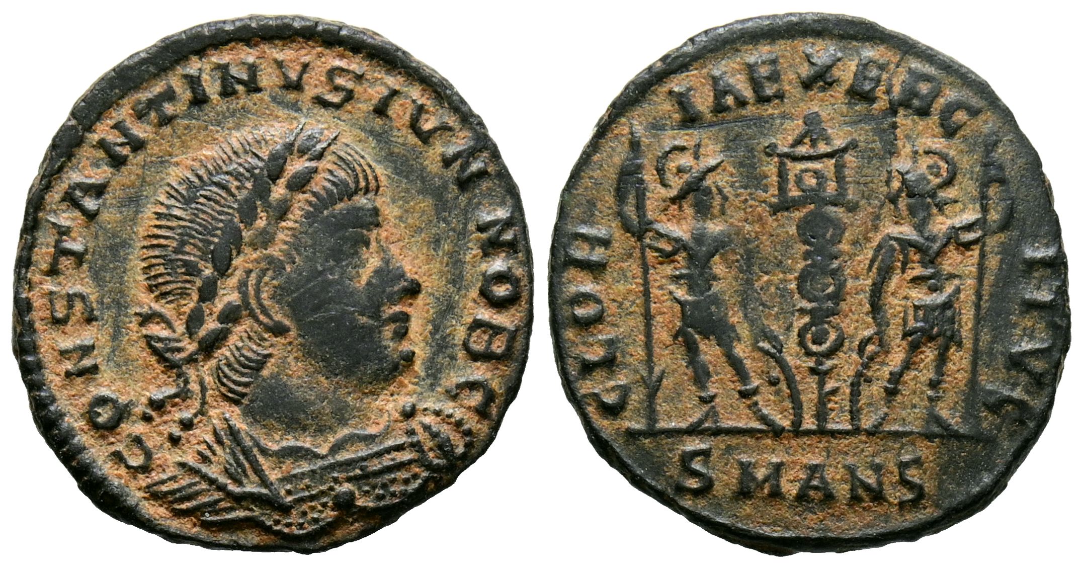 CONSTANTINO II. Follis. (Ae. 1,48g/15mm). 330-335 d.C. Antioquía. (RIC 87). Anv: Busto diademado con coraza de Constantino II a derecha, alrededor leyenda: CONSTANTINVS IVN NOB C. Rev: Dos soldados estantes enfrentados portando lanzas, entre ellos estandarte, en exergo: SMANS, alrededor leyenda: GLORIA EXERCITVS. MBC.