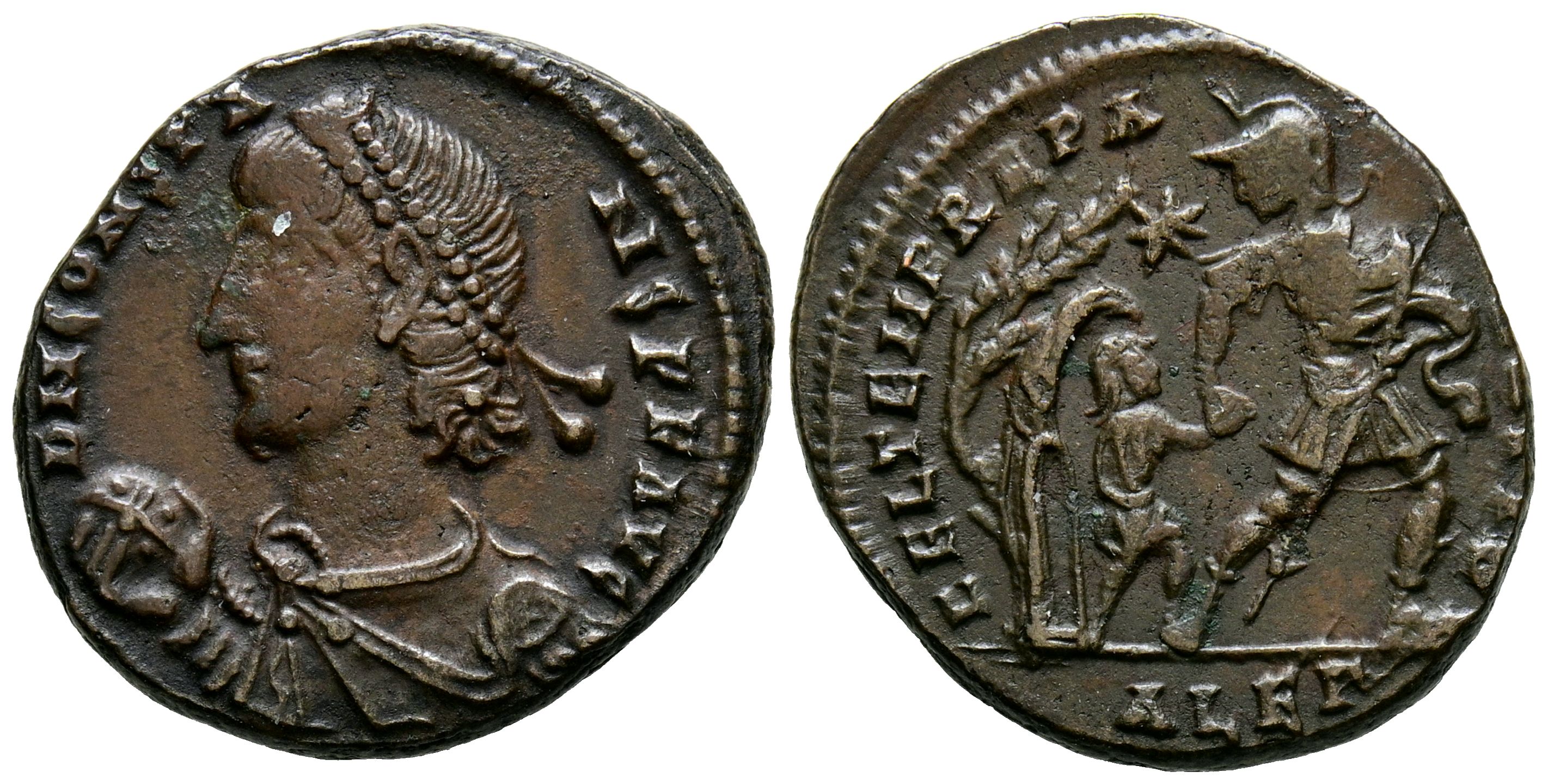 CONSTANTE. Follis. (Ae. 4,55g/21mm). 348-350 d.C. Alejandría. (RIC 60). Anv: Busto diademado, drapeado y acorazado de Constante a izquierda sosteniendo globo terráqueo con la mano derecha, alrededor leyenda: D N CONSTANS P F AVG. Rev: Soldado portando lanza y avanzando a izquierda y guiando a un barbaro desde una cabaña; bajo arbol y estrella; en exergo: ALEr, alrededor leyenda: FEL TEMP REPARATIO. MBC.