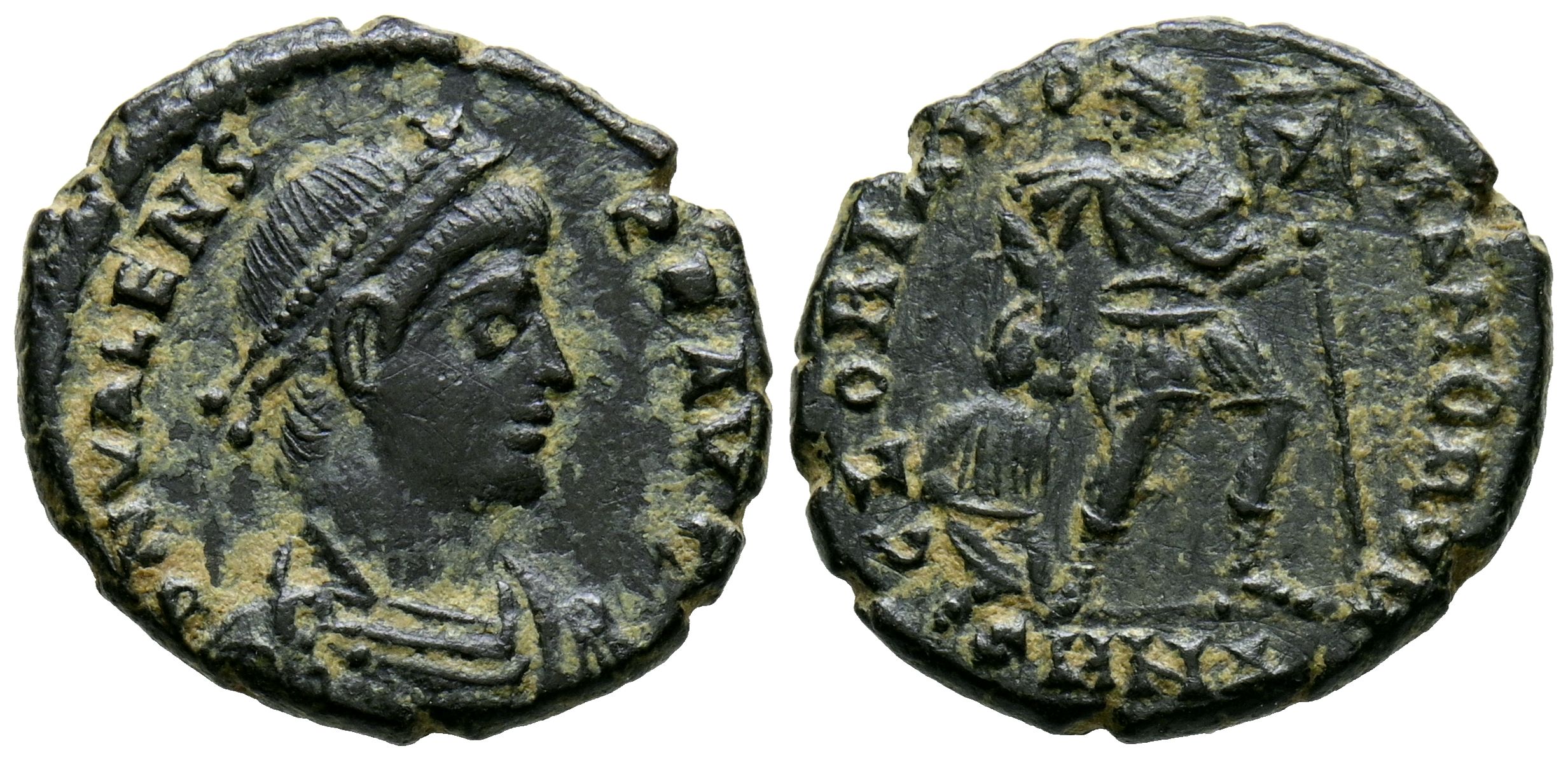 VALENTE. Nummus. (Ae. 2,89g/17mm). 364-367 d.C. Antioquía. (RIC 10b). Anv: Busto diademado, drapeado y con coraza de Valente a derecha, alrededor leyenda: D N VALENS P F AVG. Rev: Valente estante a derecha mirando a izquierda portando globo y labaro, detrás cautivo, en exergo: ANT, alrededor leyenda: GLORIA ROMANORVM. MBC.