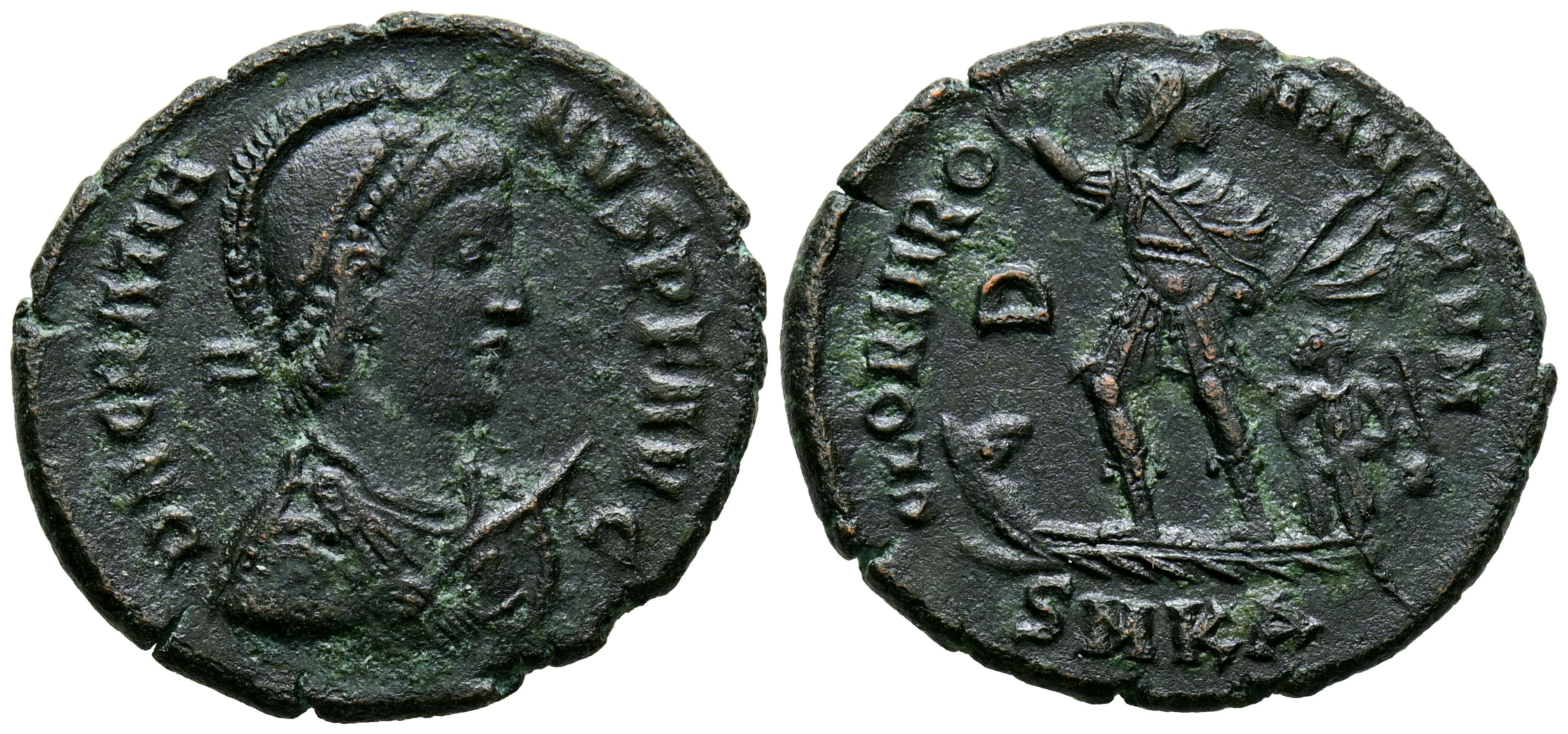 GRACIANO. Follis. (Ae. 5,32g/24mm). 378-383 d.C. Nicomedia. (RIC 14a). Anv: busto con casco, diademado, drapeado y con coraza de Graciano a derecha sosteniendo lanza y escudo, alrededor leyenda: DN GRATIANVS P F AVG. Rev: Graciano estante a la izquierda en proa levantando la mano derecha, Victoria sentada al timón, en campo D, en exergo: SMNA, alrededor leyenda: GLORIA ROMANORVM. MBC.