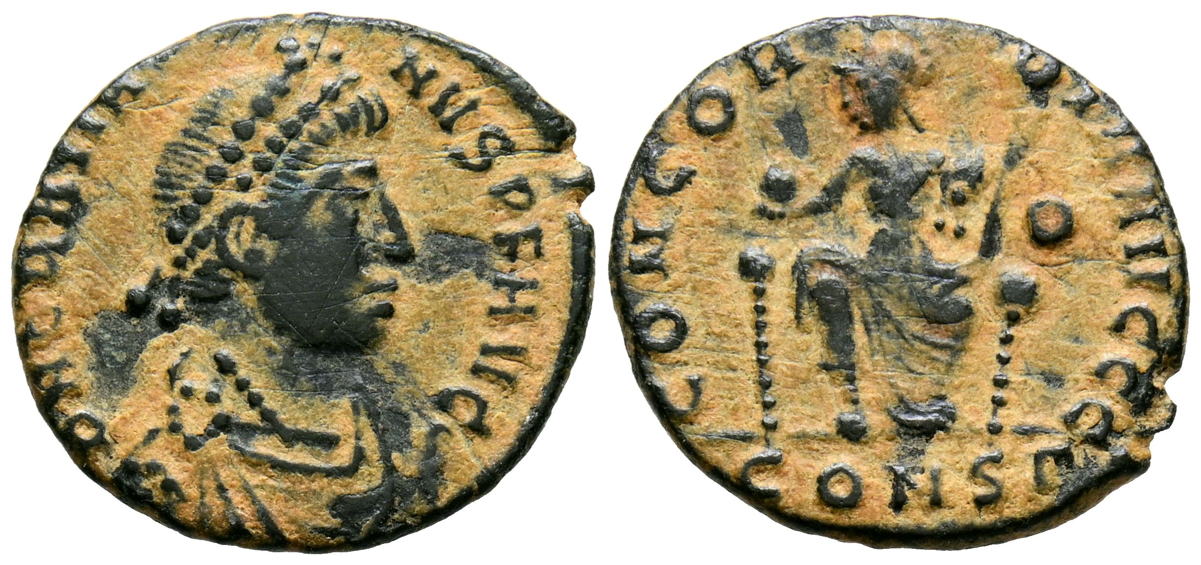 GRACIANO. Follis. (Ae. 2,02g/17mm). 367-383 d.C. Constantinopla. (RIC 56a). Anv: Busto diademado y drapeado de Graciano a derecha, alrededor leyenda: DN GRATIANVS P F AVG. Rev: Roma sentada a izquierda portando lanza y globo, en campo derecho o, en exergo: CONSr, alrededor leyenda: CONCORDIA AVGGG. MBC.