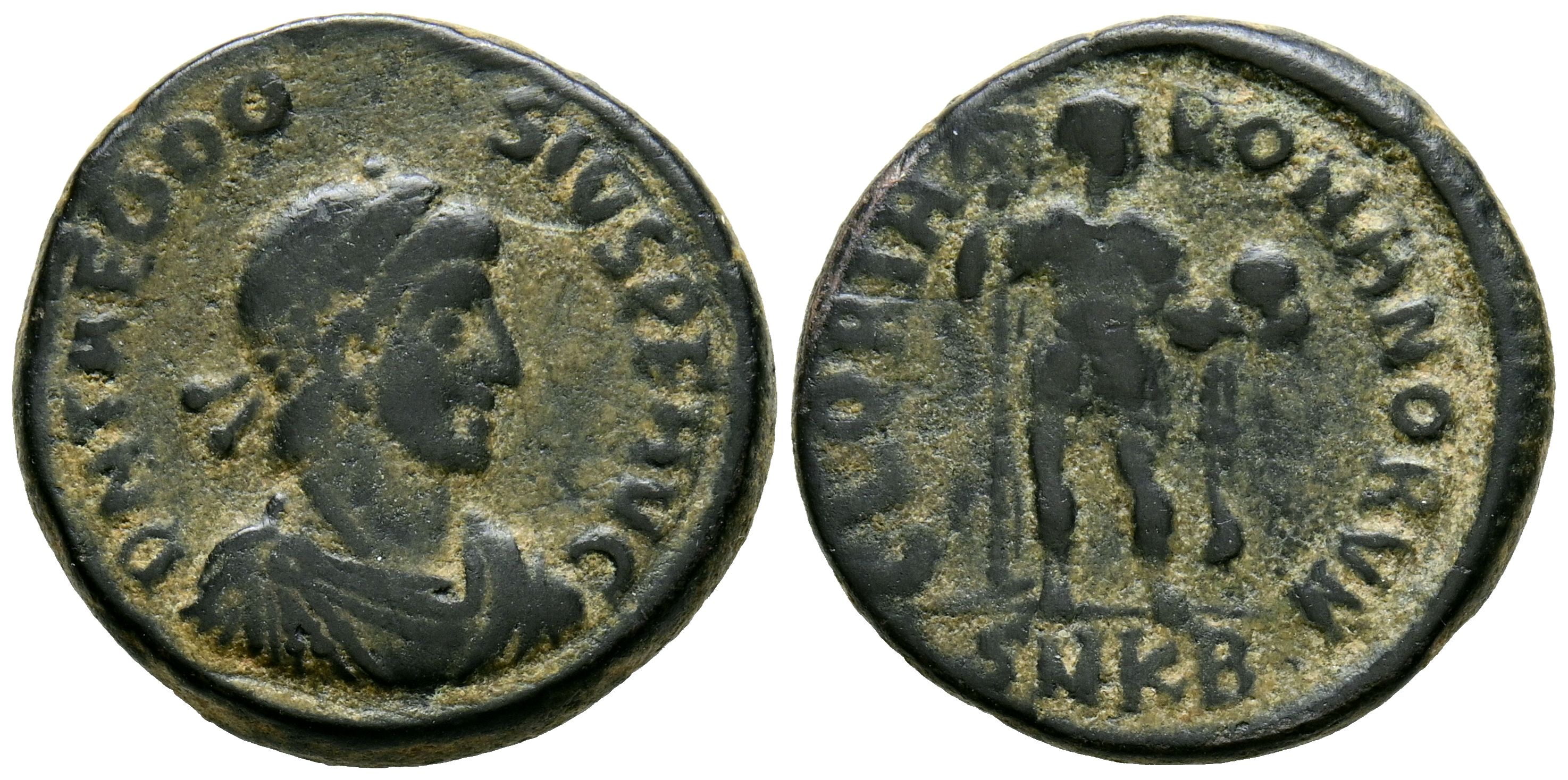 TEODOSIO I. Maiorina. (Ae. 6,11g/20mm). 379-395 d.C. Cícico. (RIC 14c). Anv: Busto diademado y drapeado de Teodosio I a derecha, alrededor leyenda: D N THEODOSIVS P F AVG. Rev: Teodosio I estante a derecha portando estandarte y globo, en exergo: SMKB, alrededor leyenda: GLORIA ROMANORVM. MBC-. Limpiado.