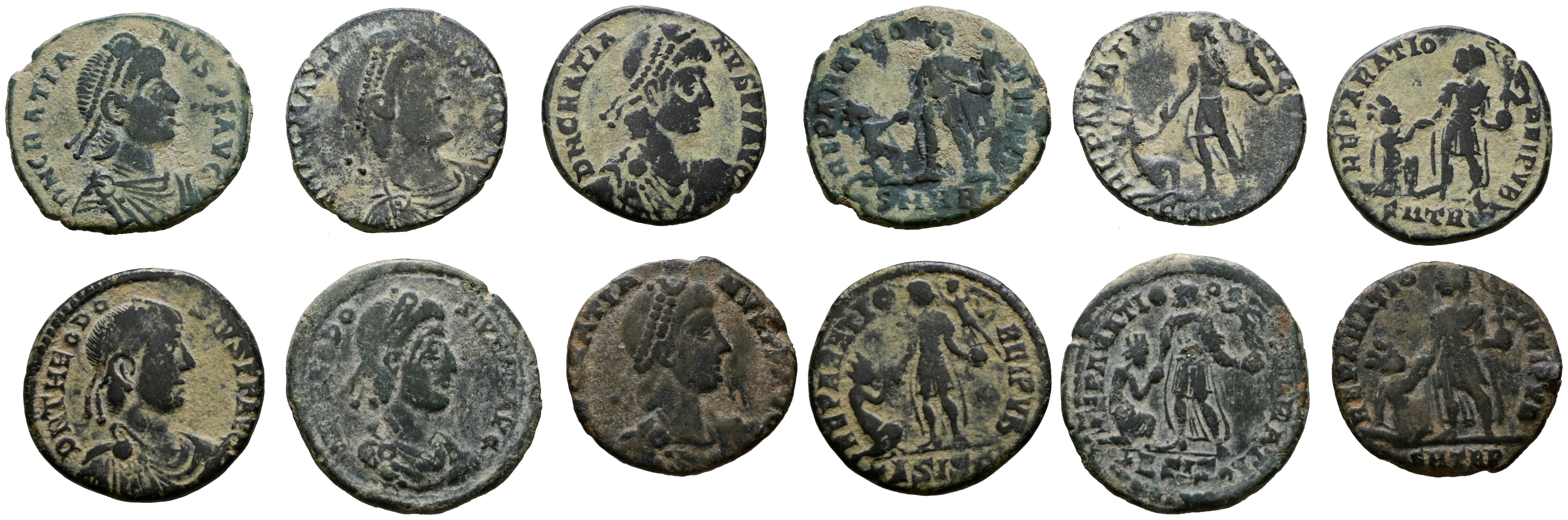 Interesante conjunto compuesto por 6 Maiorinas de los emperadores Graciano y Teodosio I de diferentes cecas. Diferentes medidas y estados de conservación. A EXAMINAR.
