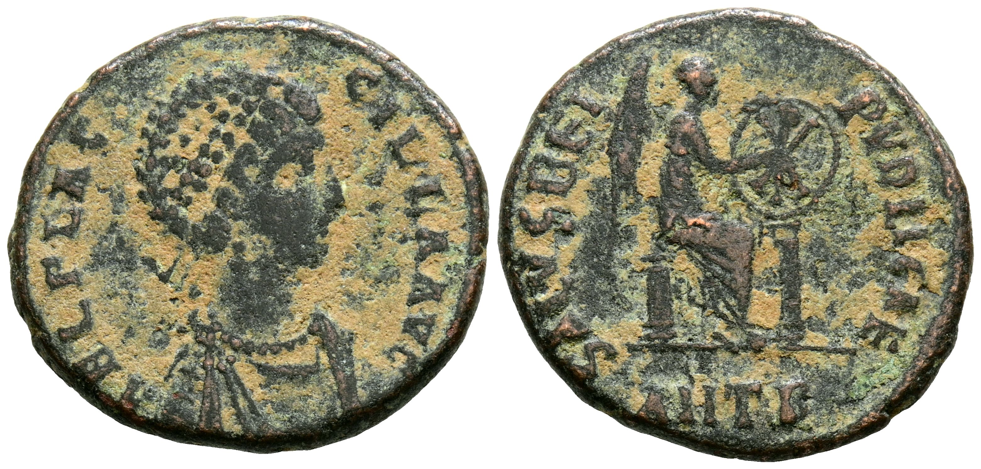 AELIA FLACILLA. Maiorina. (Ae. 5,51g/24mm). 379-383 d.C. Antioquía. (RIC 43). Anv: Busto diademado, drapeado y con coraza de Aelia Flacilla a derecha, alrededor leyenda: AEL FLACCILLA AVG. Rev: Salus sentada sobre columna a derecha portando escudo con monograma sobre columan, en exergo: ANTB, alrededor leyenda: SALVS REI PVBLICAE. MBC-.