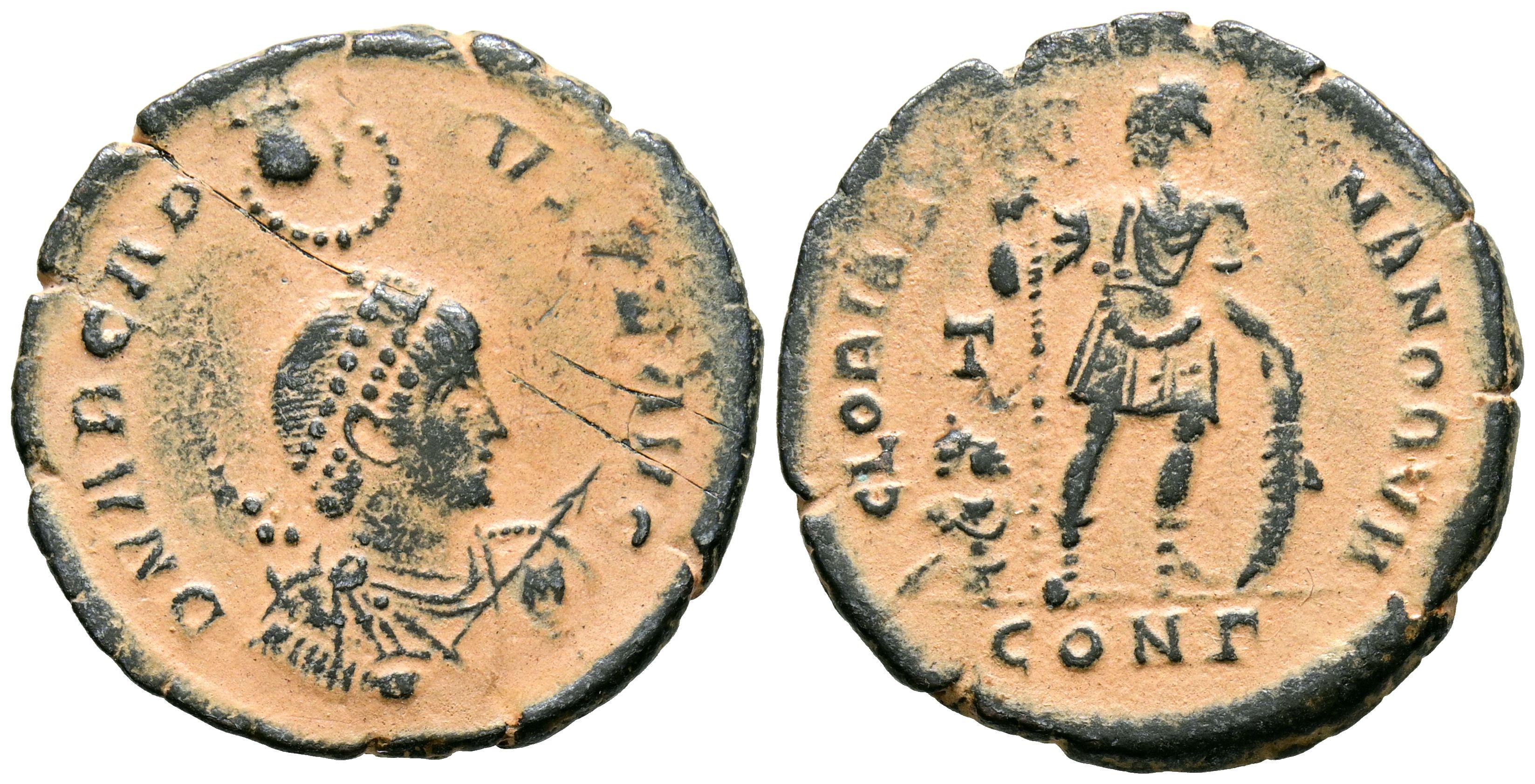 ARCADIO. Maiorina. (Ar. 4,30g/23mm). 383-388 d.C. Constantinopla. (RIC 80). Anv: Busto diademado, drapeado y con coraza de Arcadio a derecha, sobre él, corona de laurel sostenida por la mano de Dios, alrededor leyenda: DN ARCADIVS PF AVG. Rev: Arcadio estante portando lábaro y escudo, a sus pies un cautivo, en el campo T, en exergo: CONr, alrededor leyenda: GLORIA ROMANORVM. MBC.
