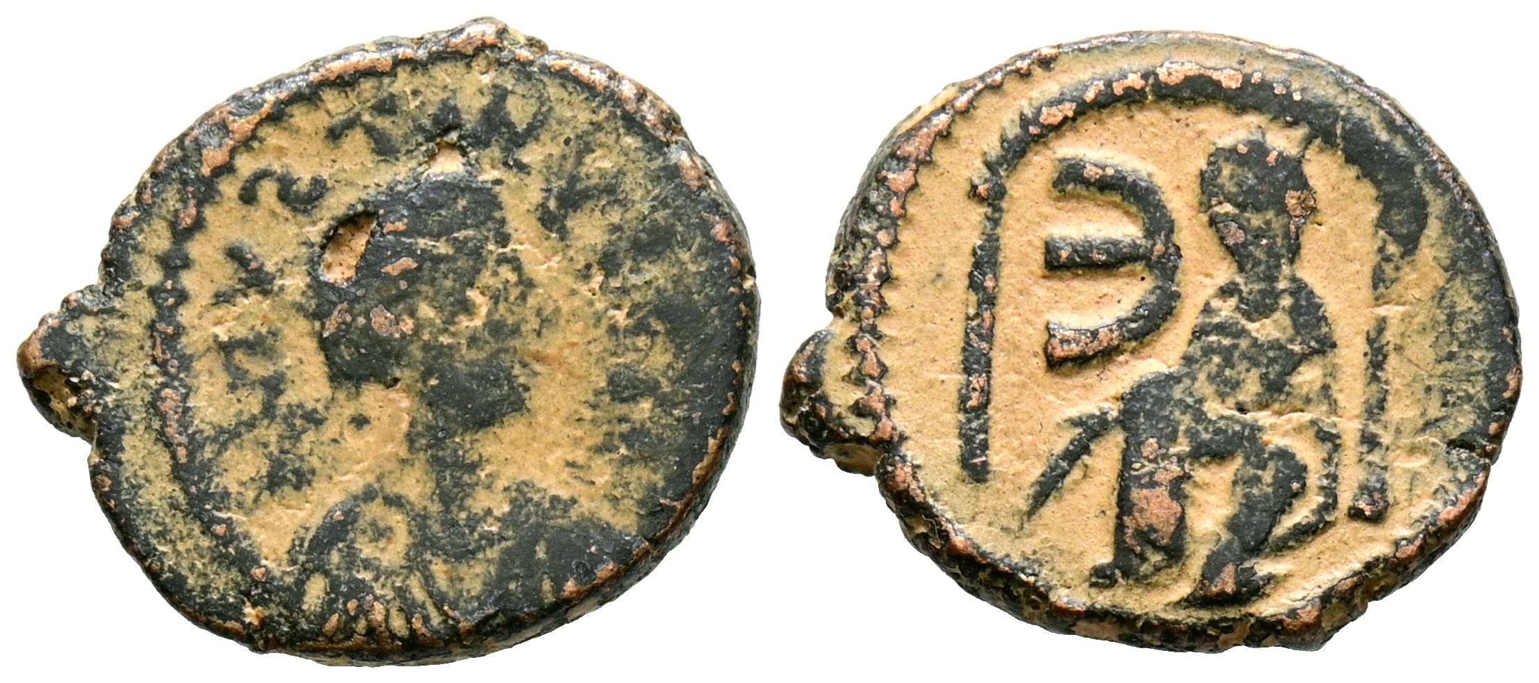 JUSTINO I. Pentanummio. (Ae. 2,18g/15mm). 518-527 d.C. Theoupolis (Antioquía). (DOC 57; Seaby 111). Anv: Busto de Justino I a la derecha. Rev: Tyche de Antioquía sedente de cara al santuario; a la izquierda E. MBC-.