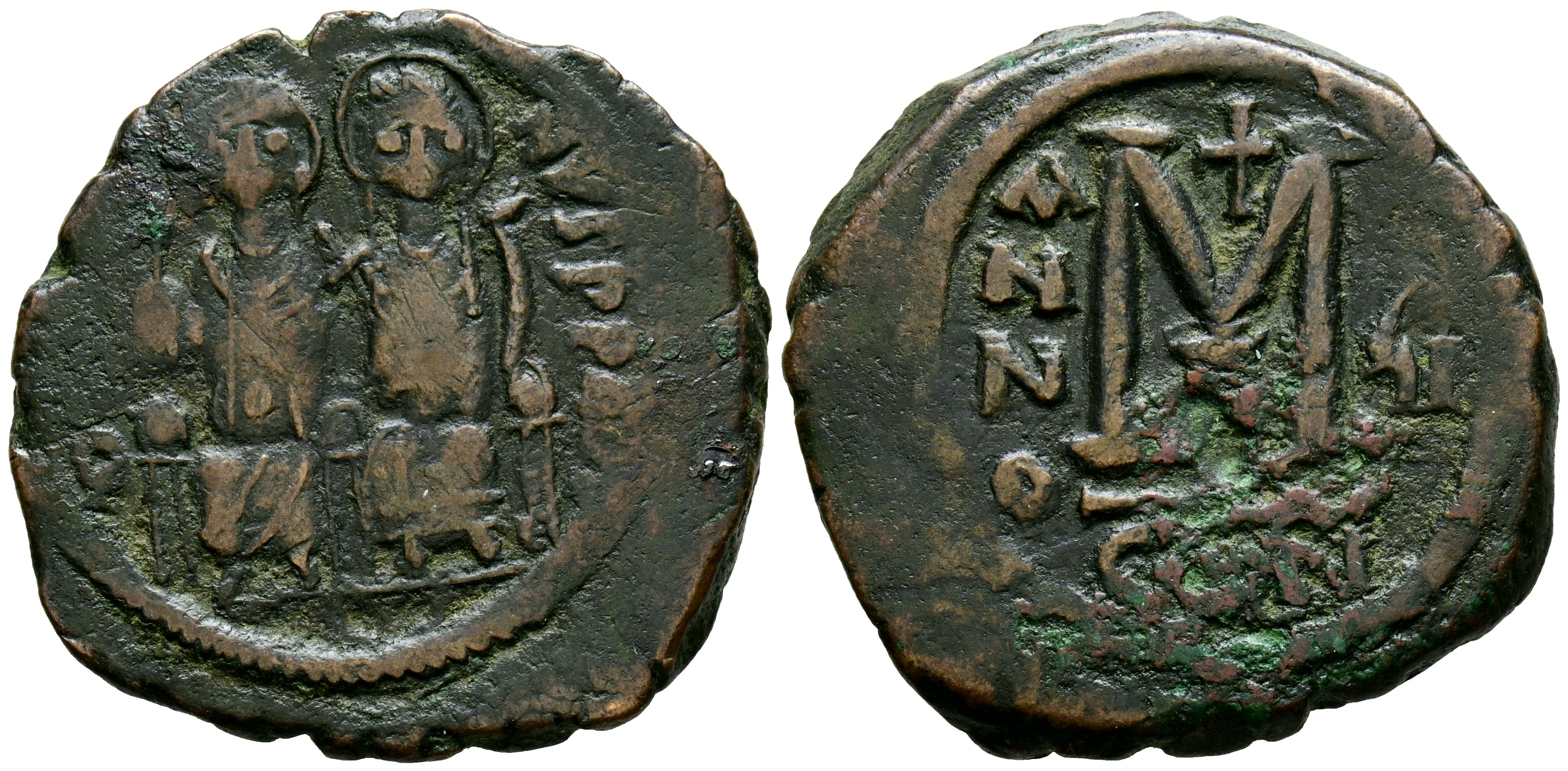 JUSTINO II Y SOFIA. Follis. (Ae. 12,68g/31mm). 571-572 d.C. Constantinopla. (Seaby 360). Anv: Justino II y Sofía estantes de frente, alrededor de la leyenda: DN IVSTINVS PP AVG. Rev: M, encima cruz latina, debajo: A, a los lados: ANNO-Ç1, en exergo: CON. MBC.