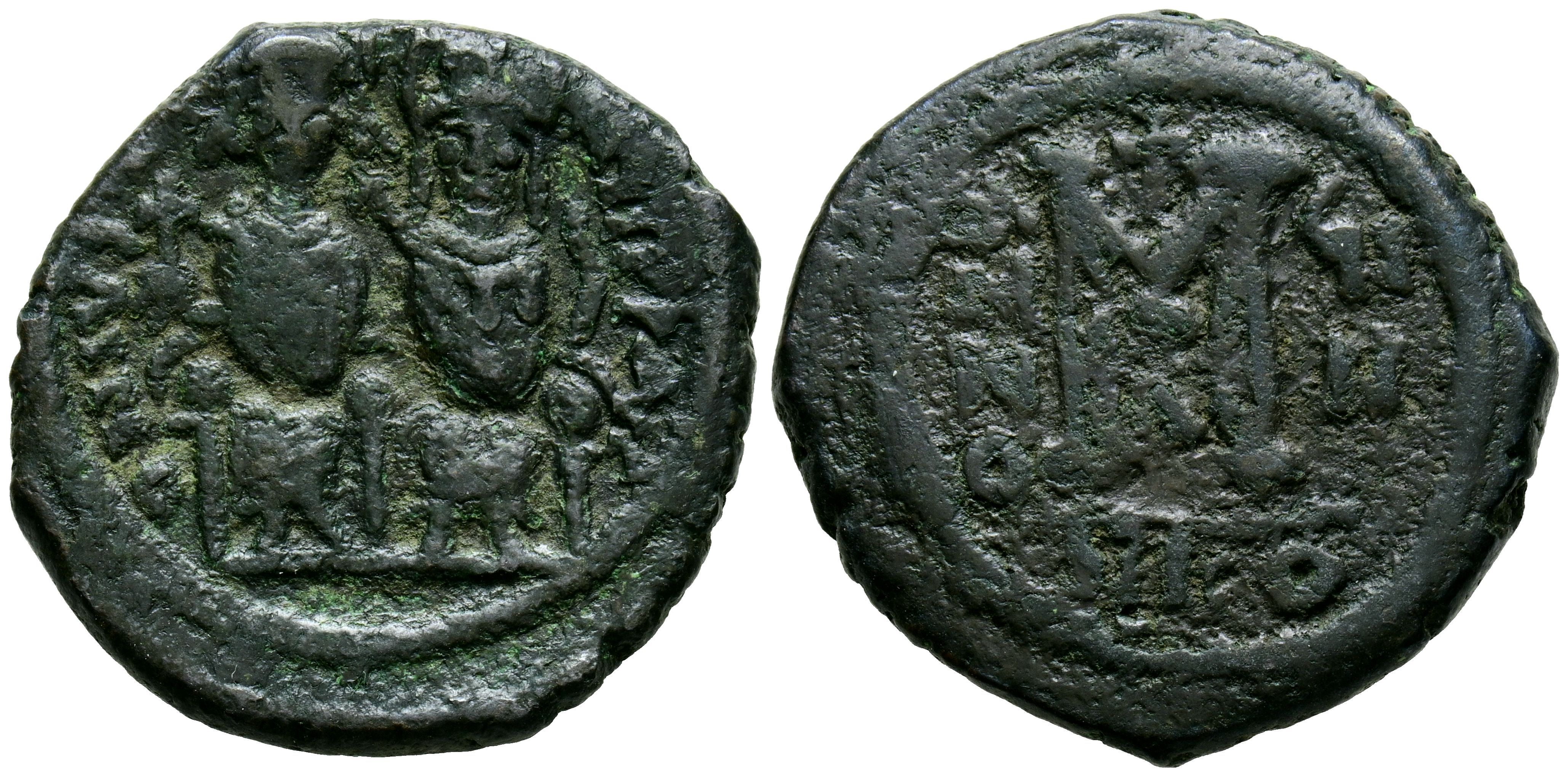 JUSTINO II y SOFIA. Follis. (Ae. 13,44g/29mm). 565-578 d.C. Nicomedia. (Seaby 369). Anv: Justino II y Sofia sentados de frente, alrededor leyenda. Rev: M grande, encima cruz y debajo B, entre: ANNO-ÇI/II, en exergo: NIKO. MBC-.