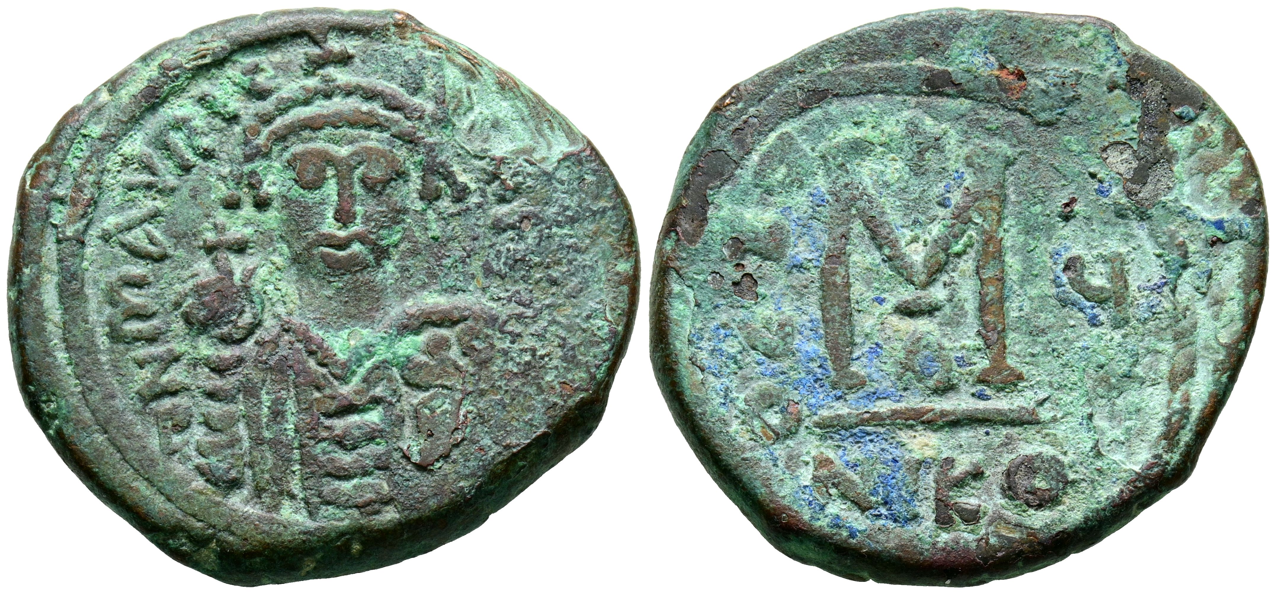MAURICIO TIBERIO. Follis. (Ae. 13,63g/30mm). 586-587 d.C. Nicomedia. (Seaby 512). Anv: Busto con casco y coraza de Mauricio Tiberio de frente portando globo y escudo, alrededor leyenda. Rev: M grande, encima cruz latina, debajo A, a la izquierda leyenda: ANNO, a la derecha: 4 y en exergo: NIKO. MBC-.