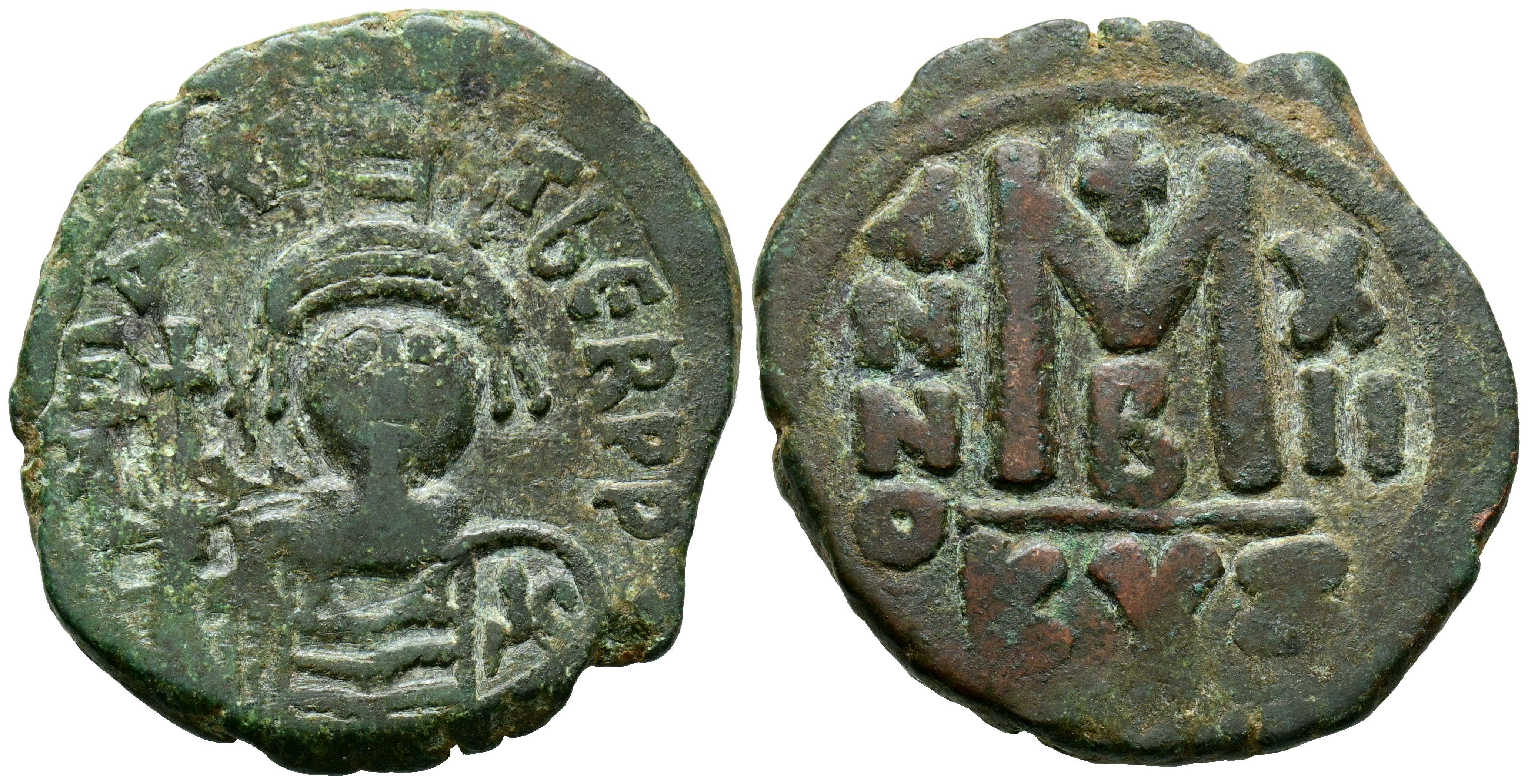 MAURICIO TIBERIO. 40 Nummi. (Ae. 11,09g/30mm). 588-589 d.C. Cícico. (Seaby 518). Anv: Busto con casco y coraza de frente portando globo y escudo, alrededor leyenda: N M AVRI TBER PP. Rev: M grande, debajo B, encima cruz, a la izquierda leyenda: ANNO, a la derecha: X/II y en exergo: KYZ. MBC.