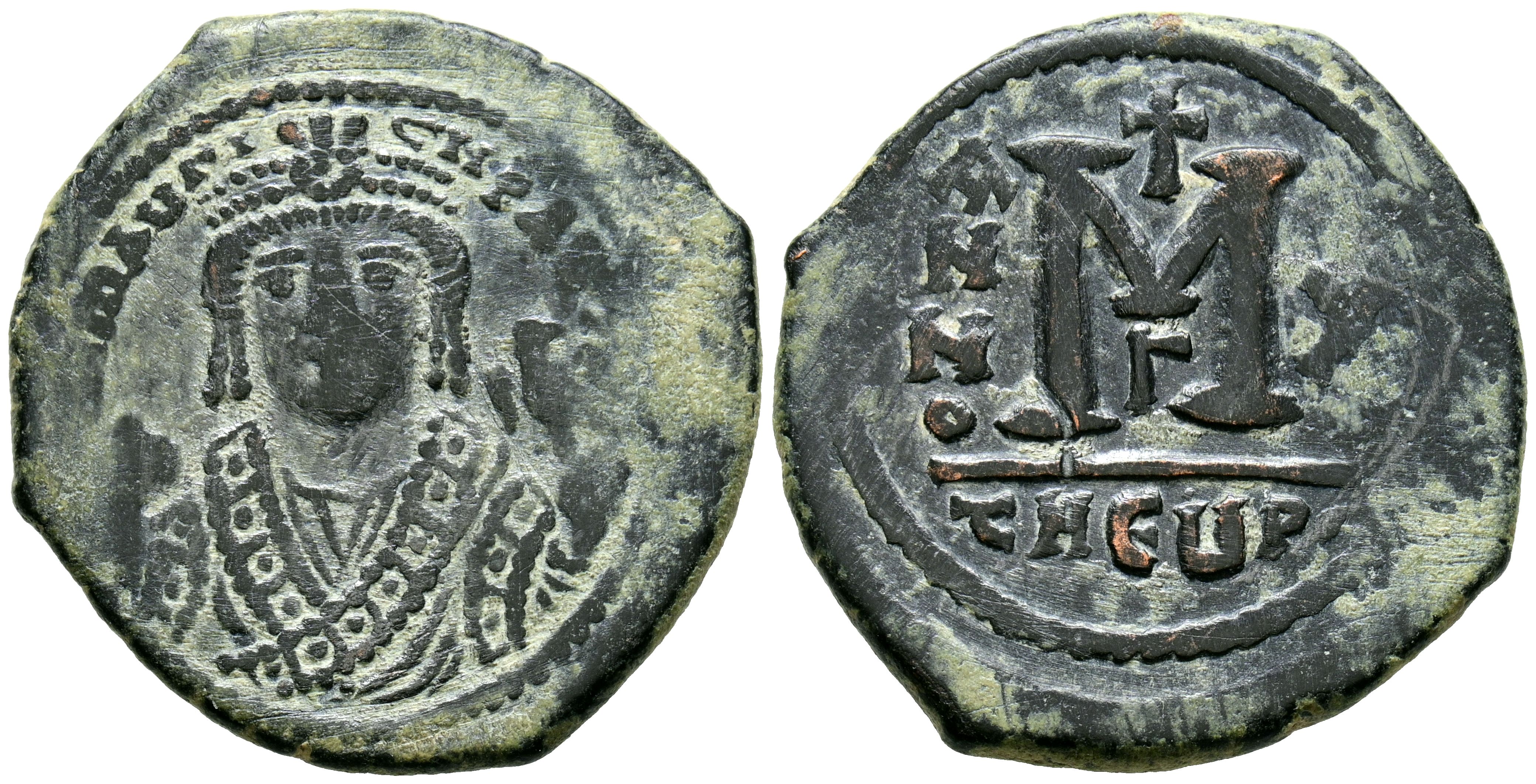 MAURICIO TIBERIO. Follis. (Ae. 11,70g/31mm). Año X (591-592 d.C.). Theoupolis (Antioquía). (Seaby 533). Anv: Busto de Mauricio Tiberio de frente con coraza y corona, alrededor leyenda: DN MAVRI C N P AVT. Rev: M grande, entre: ANNO-X, encima cruz, debajo: r, en exergo: THEUPS. MBC.