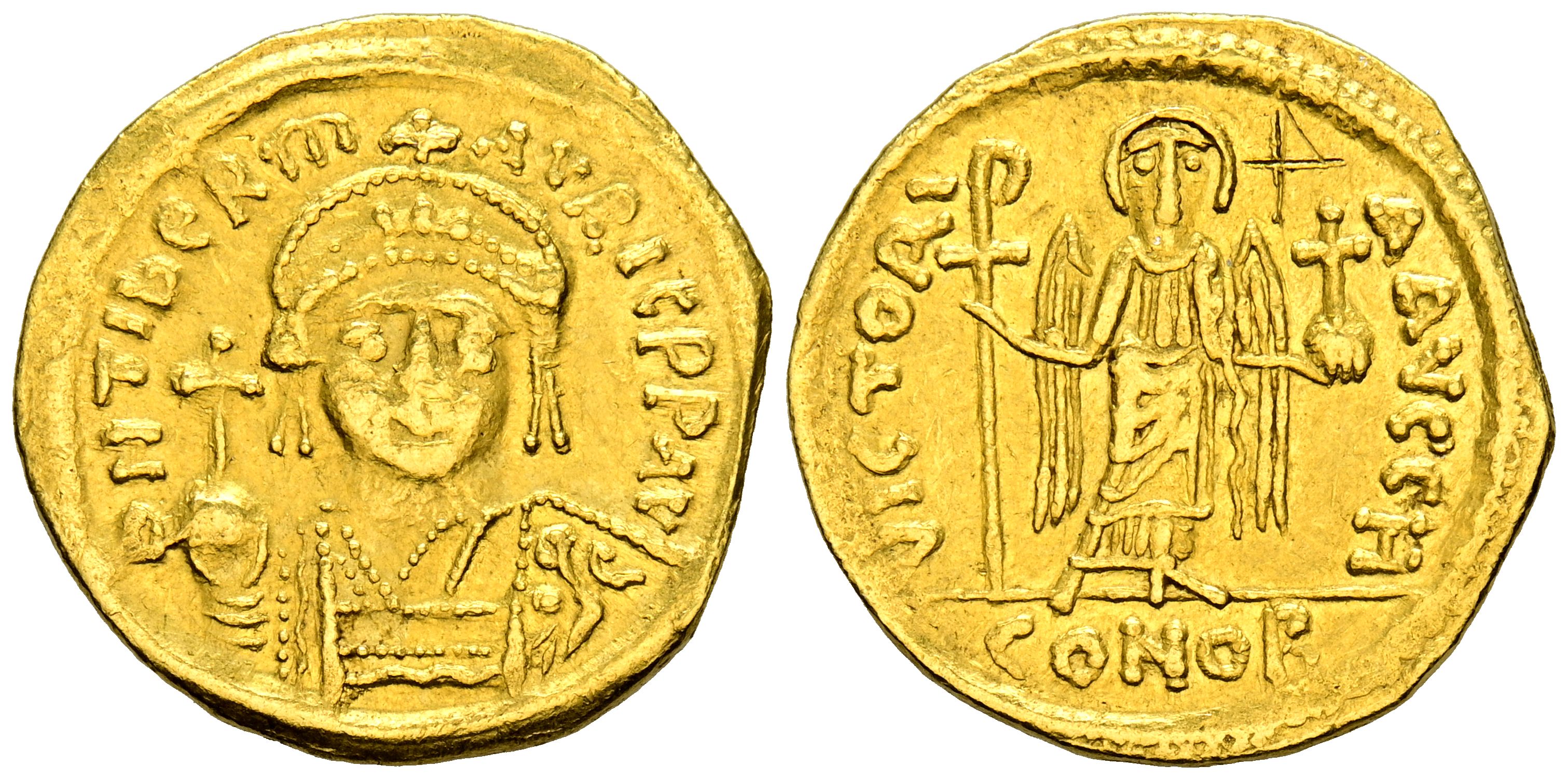 MAURICIO TIBERIO. Sólido. (Au. 4,33g/21mm). 583-601 d.C. Constantinopla. (Seaby 478). Anv: Busto drapeado y con coraza de Mauricio Tiberio de frente portando globo crucífero y escudo, alrededor leyenda: O N mAVRC TIb P P AVC. Rev: Angel estante de frente portando estaurograma largo y globo crucífero,debajo: CONOB, alrededor leyenda: VICTORIA AVGG H. MBC. Grafiti en forma de cruz en reverso. Limpiado.