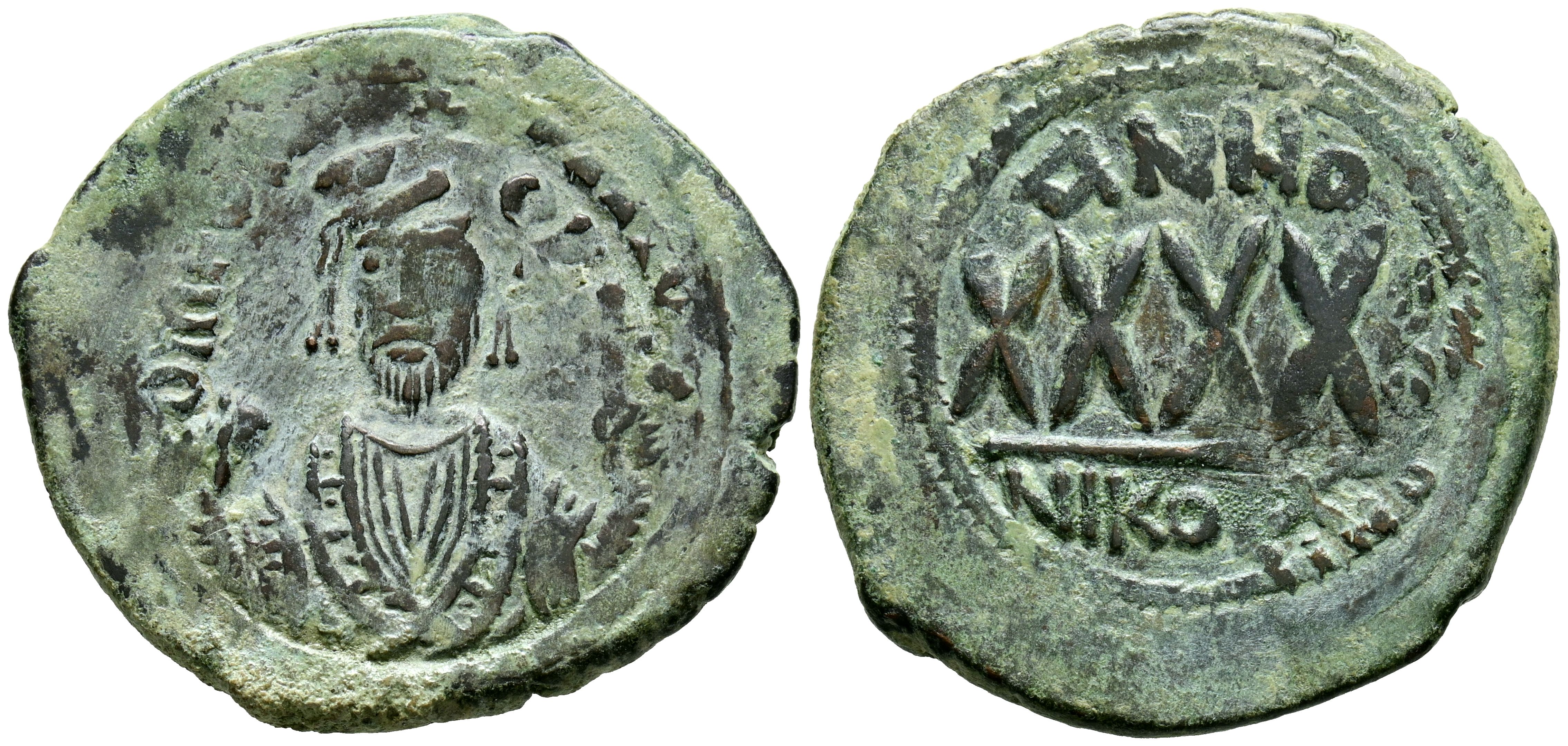 FOCAS. Follis. (Ae. 12,52g/32mm). 602-610 d.C. Nicomedia. (Seaby 659). Anv: Busto coronado de Focas, vestido con hábito consular, portando mapa y Cruz, alrededor leyenda: δ m FOCAS PER AVC. Rev: ANNO / XXXX, en exergo: NIKO. MBC.