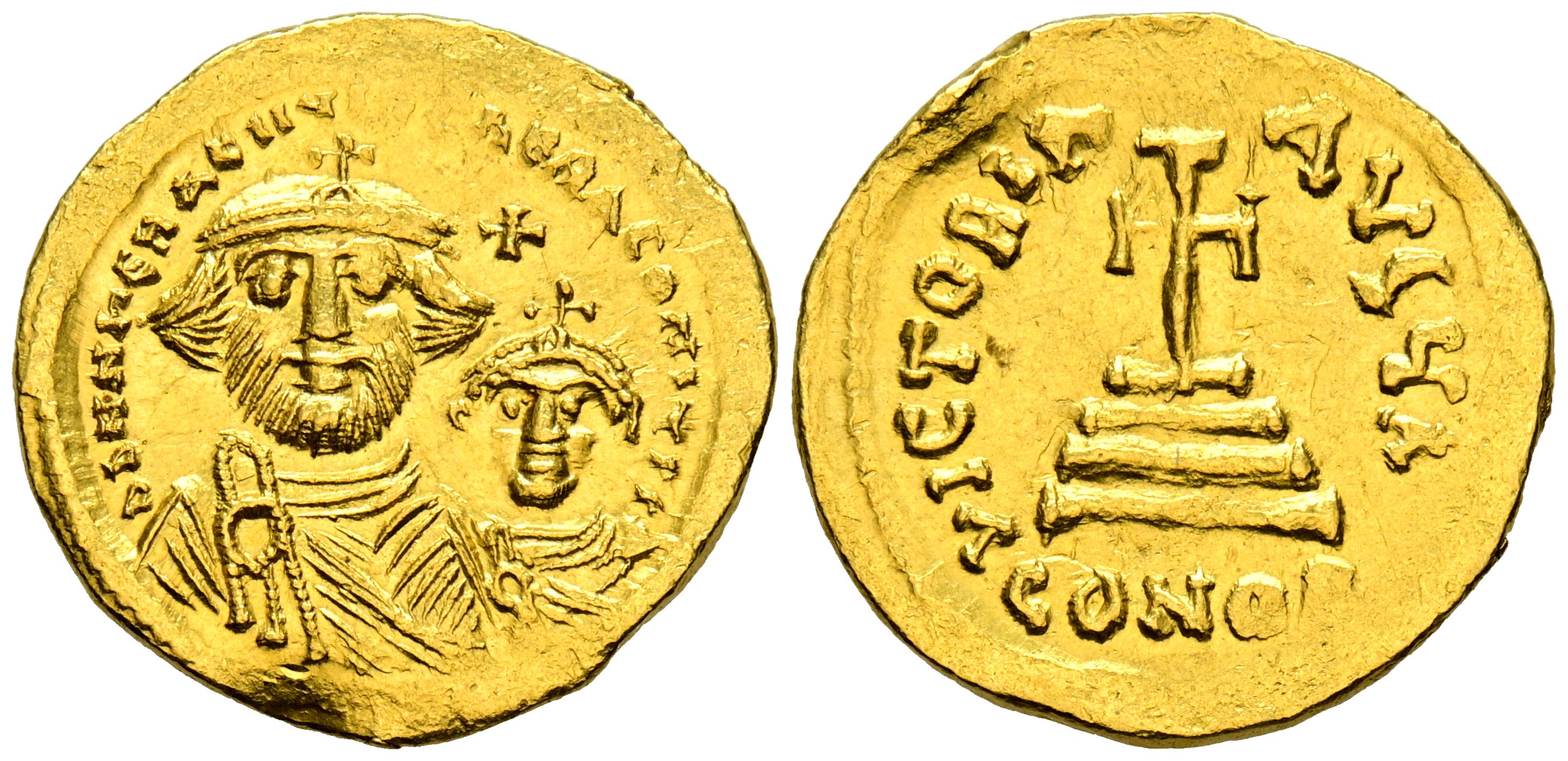 HERACLIO y HERACLIO CONSTANTINO. Sólido. (Au. 4,31g/21mm). 626-629 d.C. Constantinopla. (Seaby 743). Anv: Bustos coronados y drapeados de frente de Heraclio y Heraclio Constantino, sobre ellos cruz, alrededor leyenda: dd NN hЄRACLIЧS Єt hЄRA CONSt P P AV. Rev: Cruz potenzada sobre tres escalones, debajo: CONOB, alrededor leyenda: VICTORIA-AVϚЧ A. EBC. Precioso ejemplar, escaso así.