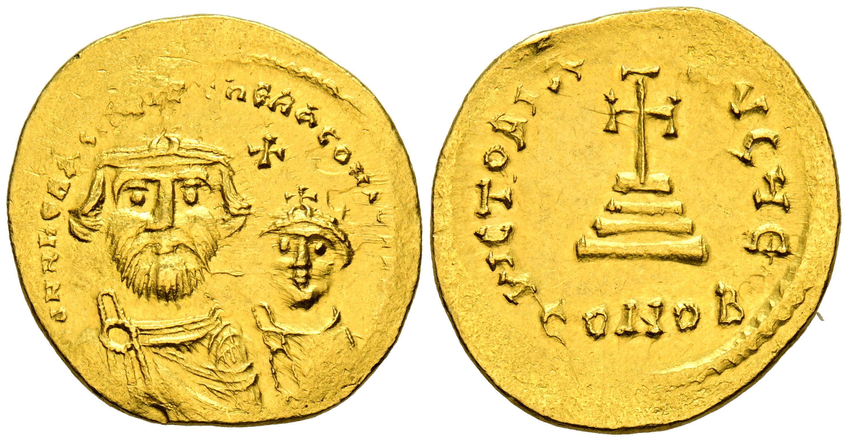 HERACLIO y HERACLIO CONSTANTINO. Sólido. (Au. 4,44g/22mm). 626-629 d.C. Constantinopla. (Seaby 743). Anv: Bustos coronados y drapeados de frente de Heraclio y Heraclio Constantino, sobre ellos cruz, alrededor leyenda: dd NN hЄRACLIЧS Єt hЄRA CONSt P P AV. Rev: Cruz potenzada sobre tres escalones, debajo: CONOB, alrededor leyenda: VICTORIA-AVϚЧ Є. EBC-.