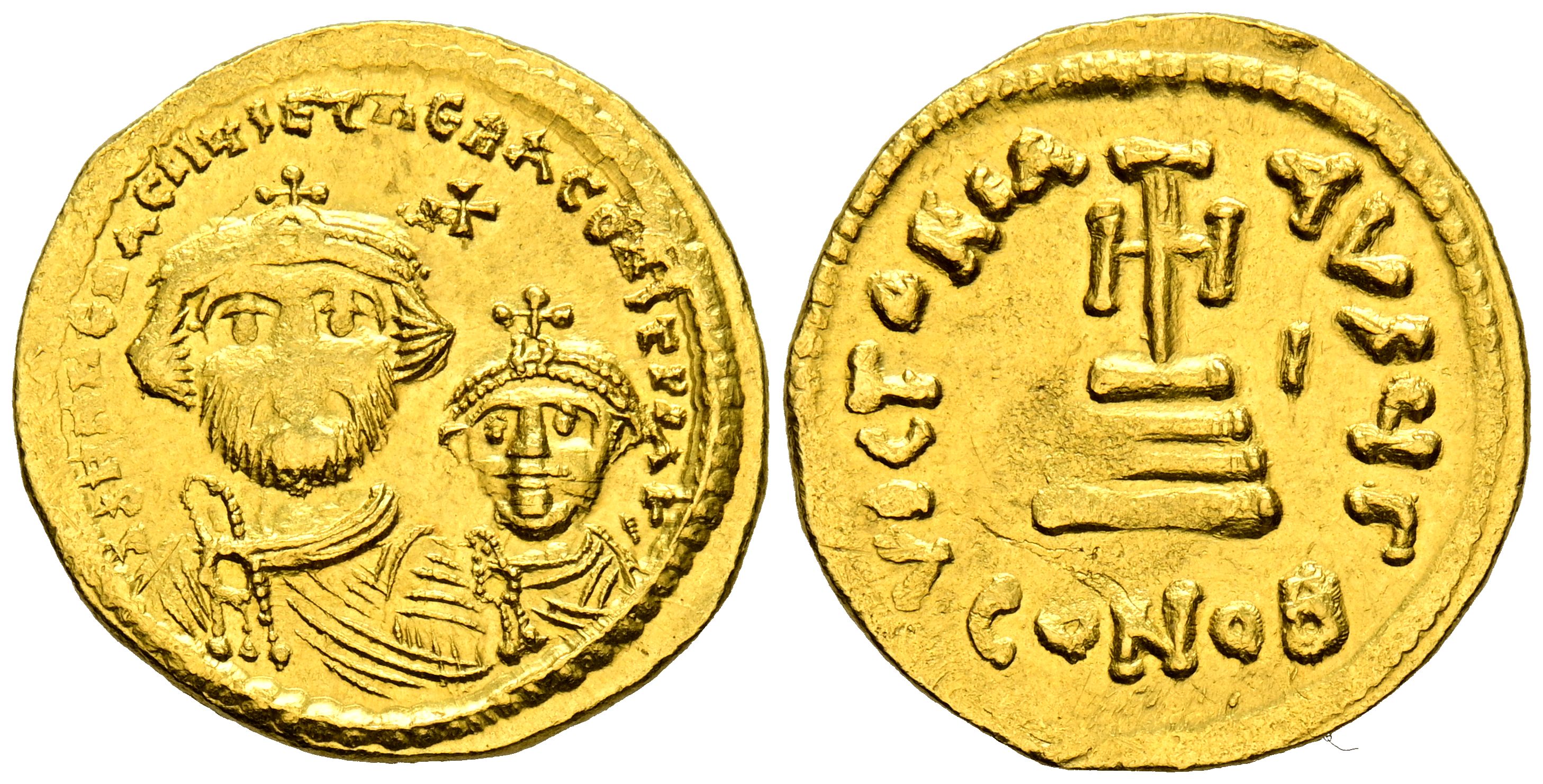 HERACLIO y HERACLIO CONSTANTINO. Sólido. (Au. 4,47g/21mm). 626-629 d.C. Constantinopla. (Seaby 743). Anv: Bustos coronados y drapeados de frente de Heraclio y Heraclio Constantino, sobre ellos cruz, alrededor leyenda: dd NN hЄRACLIЧS Єt hЄRA CONSt P P AV. Rev: Cruz potenzada sobre tres escalones, debajo: CONOB, alrededor leyenda: VICTORIA-AVϚЧ H. EBC. Precioso ejemplar, escaso así.