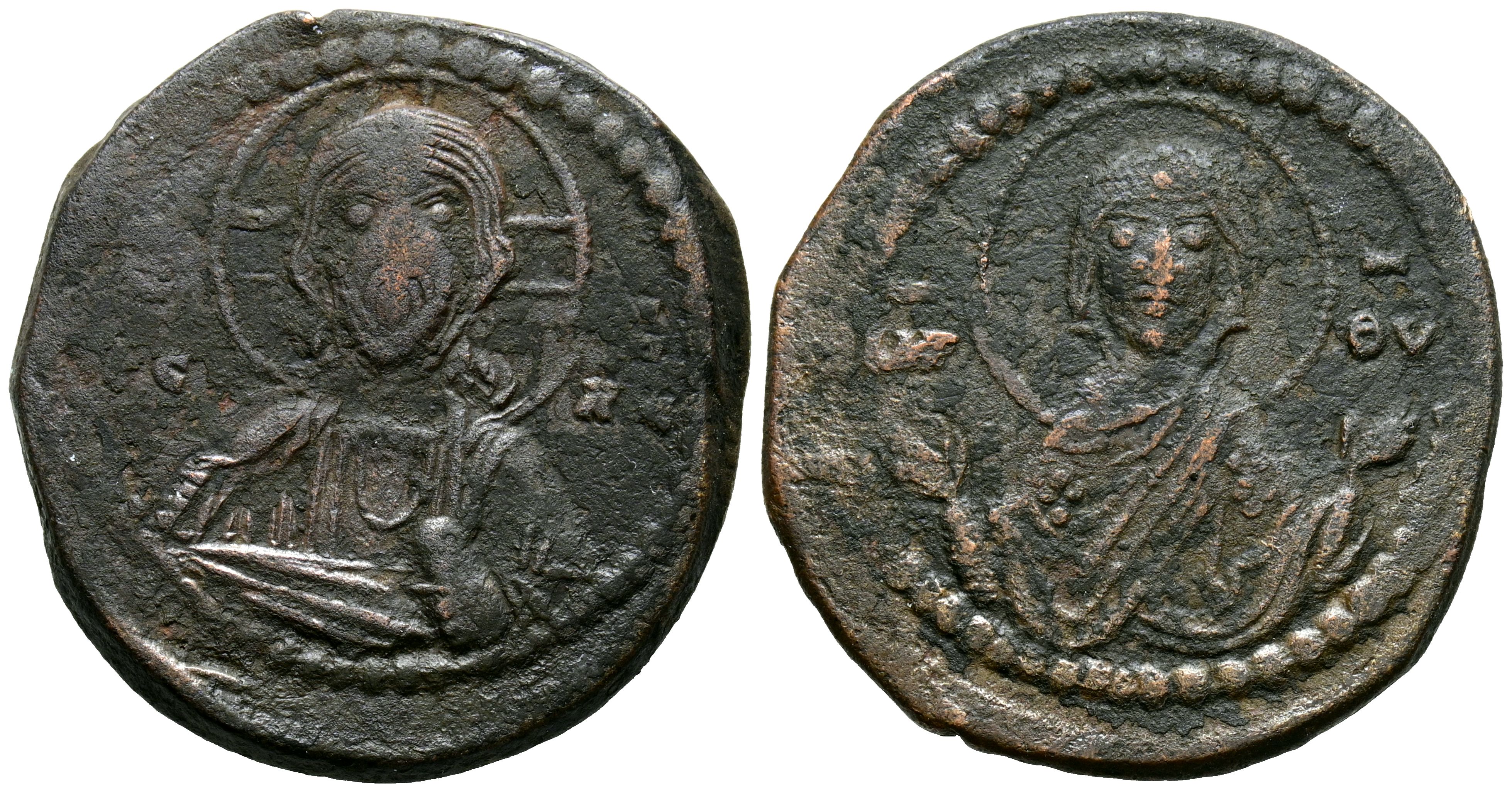 ANONIMO, atribuído a Romano IV. Follis. (Ae. 11,48g/29mm). 1068-1071 d.C. (Sear 1867). Anv: Busto nímbado de Cristo de frente, vestido con túnica y himation, sosteniendo un pergamino, en campo: IC-XC. Rev: Busto nímbado de Virgen de frente y orante, en campo, MHP-ΘV. MBC-.