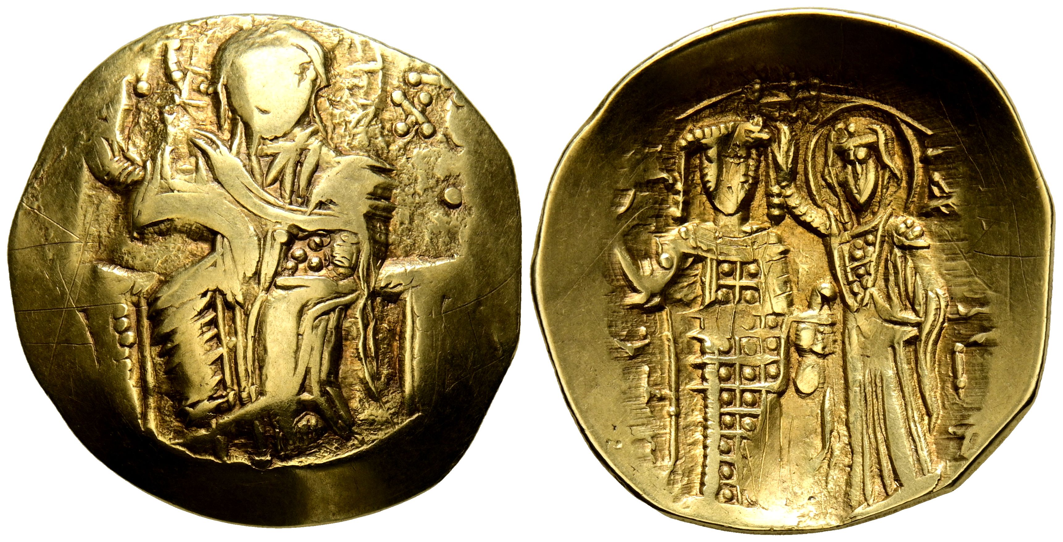 JUAN II COMNENUS. Histamenon. (Au. 3,98g/24mm). 1118-1143 d.C. Constatinopla. (Seaby 1939). Abv: Cristo sentado de frente en trono con túnica alzando la mano derecha y portando libro, entre: IC-XC. Rev: Juan II estante de frente portando cetro y daga siendo coronado por la virgen, alrededor leyenda. MBC-.
