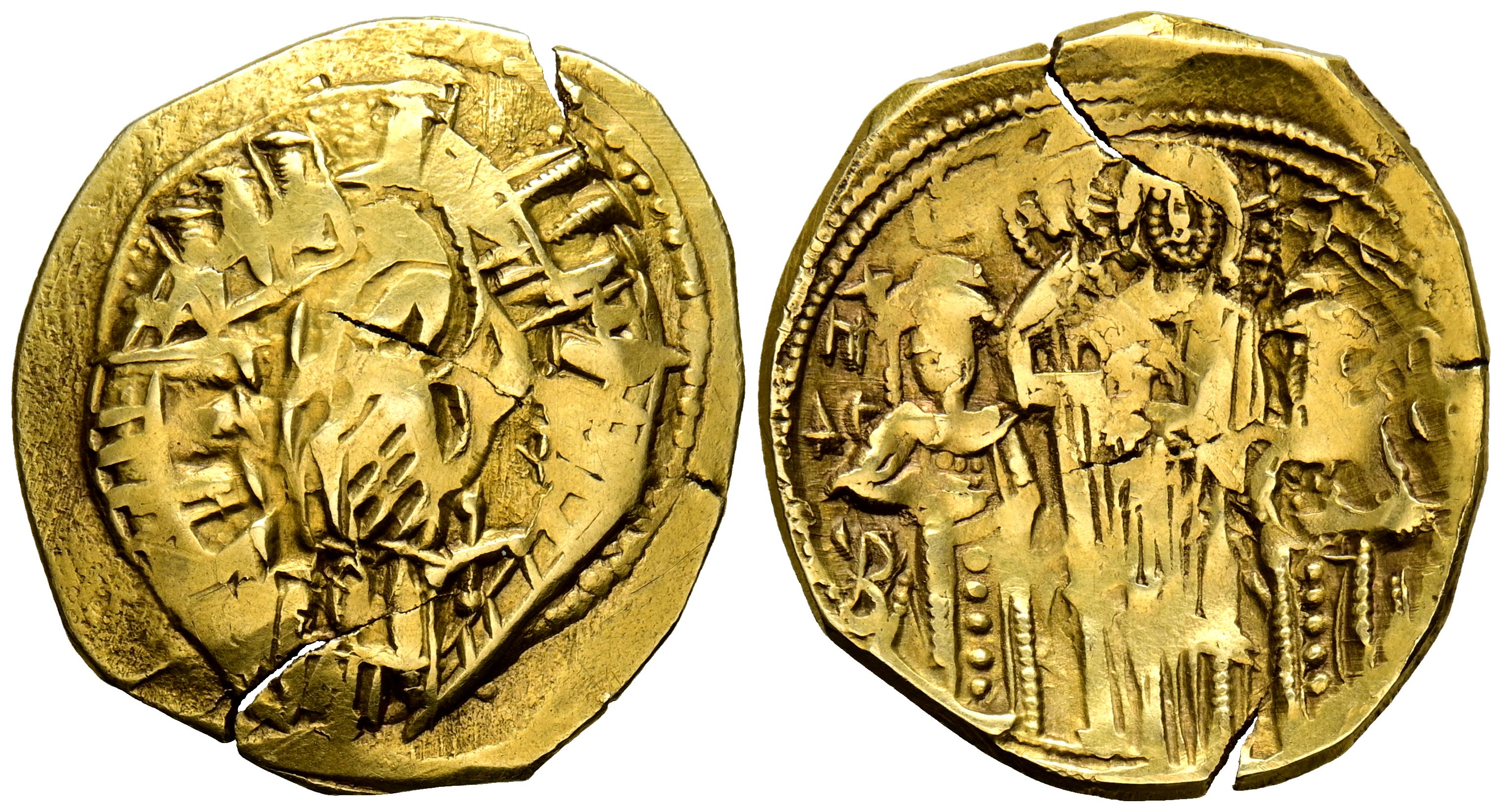 ANDRONICO II y MIGUEL IX. Histamenon. (Au. 3,64g/23mm). 1295-1320 d.C. Constantinopla. (Seaby 2396). Anv: Virgen María rezando dentro de muralla con seis torres. Rev: Cristo estante de frente coronando a Andrónico II y Miguel IX arrodillados a ambos lados. MBC-