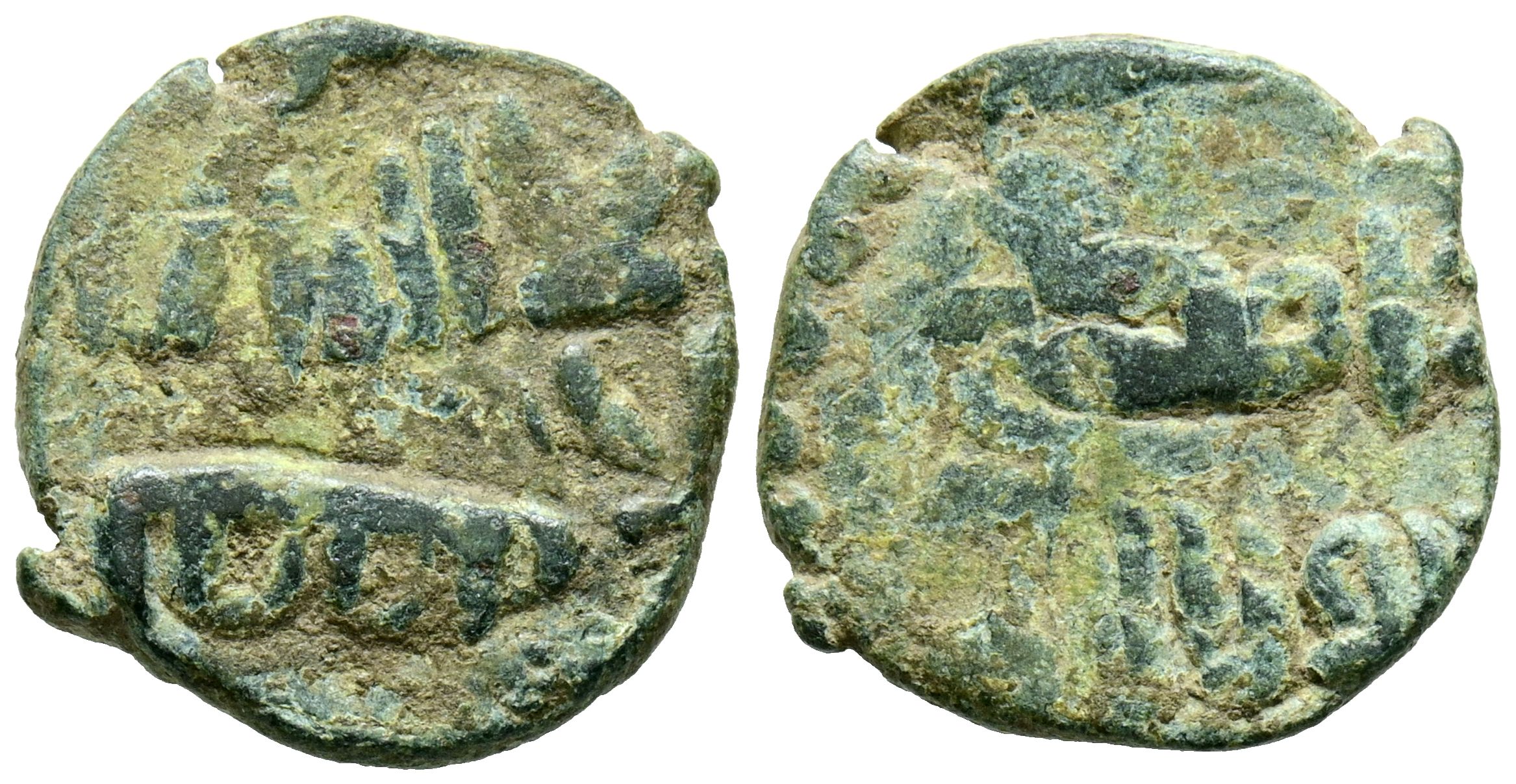 EMIRATO DEPENDIENTE DE CÓRDOBA, PERIODO DE GOBERNADORES. Anónimo. Felús. (Ar. 2,86g/18mm). S/D. (Frochoso II-a/XI-a). Anv: نفقة ''Se contribuye'', sobre: لااله ا. Rev: سواالله / محمدر (Muhammad enviado de Dios). MBC. Reacuñación en anverso. Rara e interesante para estudio.''Este tipo, de los denominados ``feluses de la invasión´´, problablemente fueron acuñados en el año 92H en Tánger. Sus leyendas están estrechamente relacionadas entre sí, haciendo alusión a la soldada recibida por los guerreros participantes en la Yihad (guerra Santa) y al impuesto cobrado en el nombre de Allah destinado a pagar los soldados.''