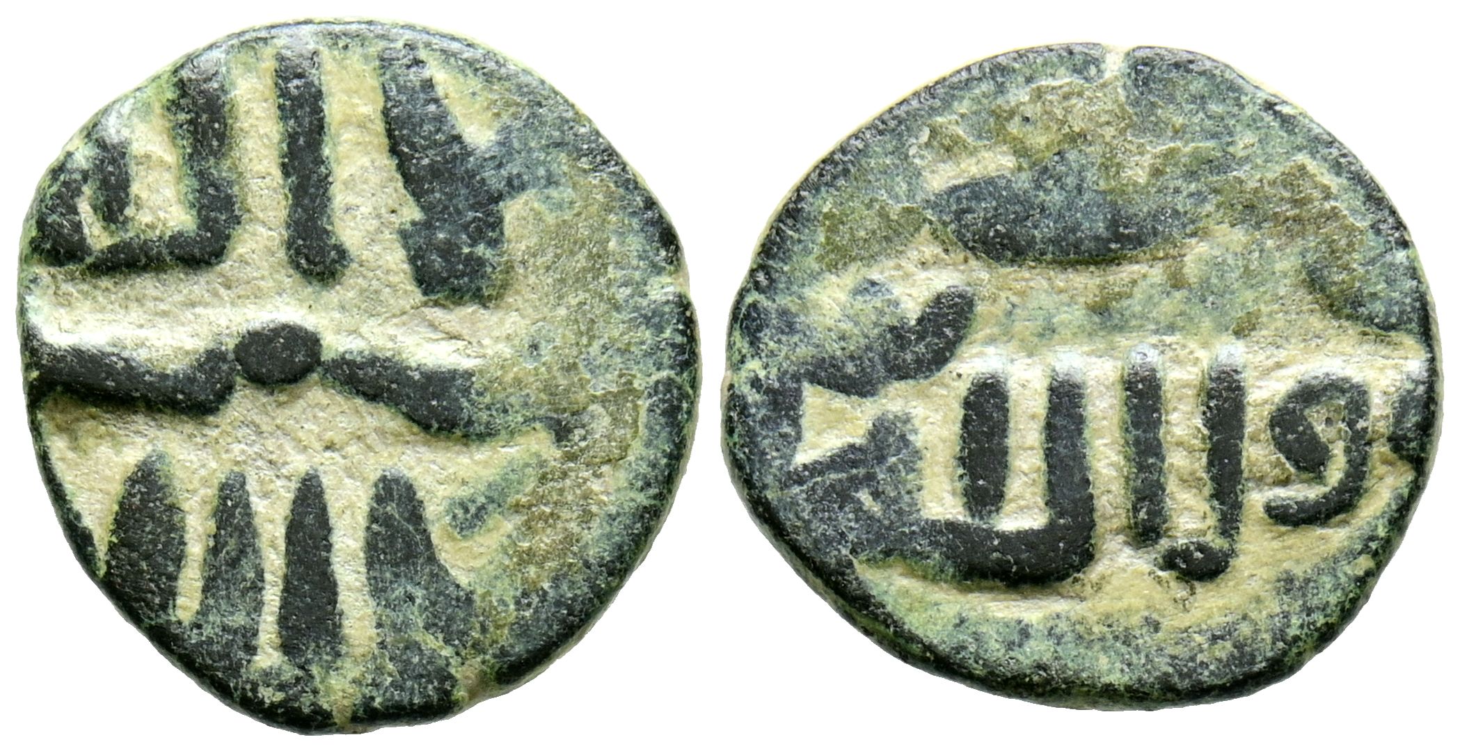 EMIRATO DEPENDIENTE DE CÓRDOBA, PERIODO DE GOBERNADORES. Anónimo. Felús. (Ae. 2,11g/15mm). S/D. (Frochoso II-e). Anv: لاالله/ لااله ا con adornos serpenteante. Rev: سواالله / محمدر, con adorno de tulipan. MBC+. Atractivo ejemplar.