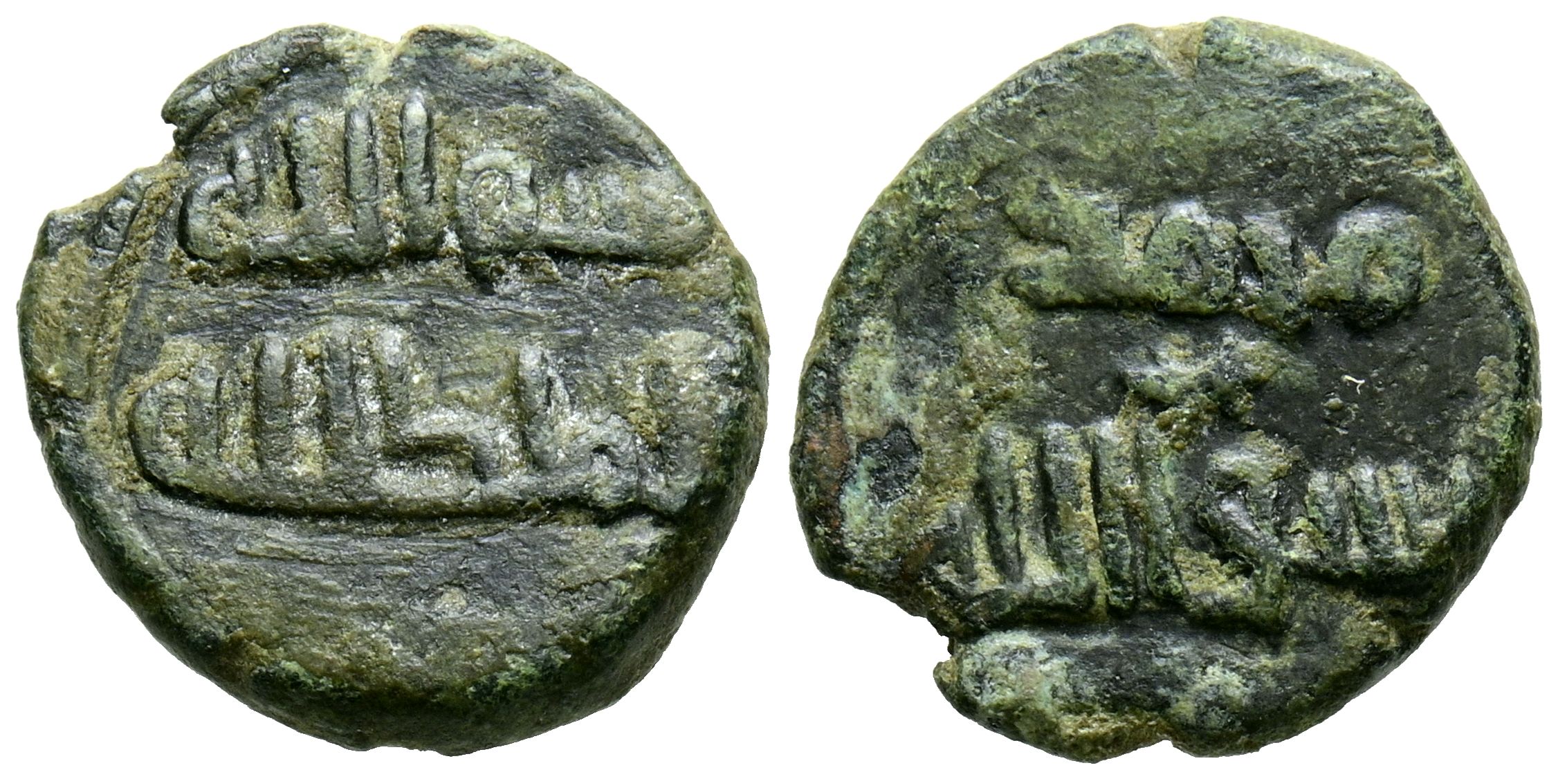 EMIRATO DEPENDIENTE DE CÓRDOBA, PERIODO GOBERNADORES. Anónimo. Felús. (Ae. 2,85g/15mm). S/D. (Frochoso X-a). Anv: الملك الله / بسم الله (En el nombre de Dios/ el reino de Dios). Rev: سواالله / محمدر (Muhammad enviado de Dios) estrella entre líneas. MBC.