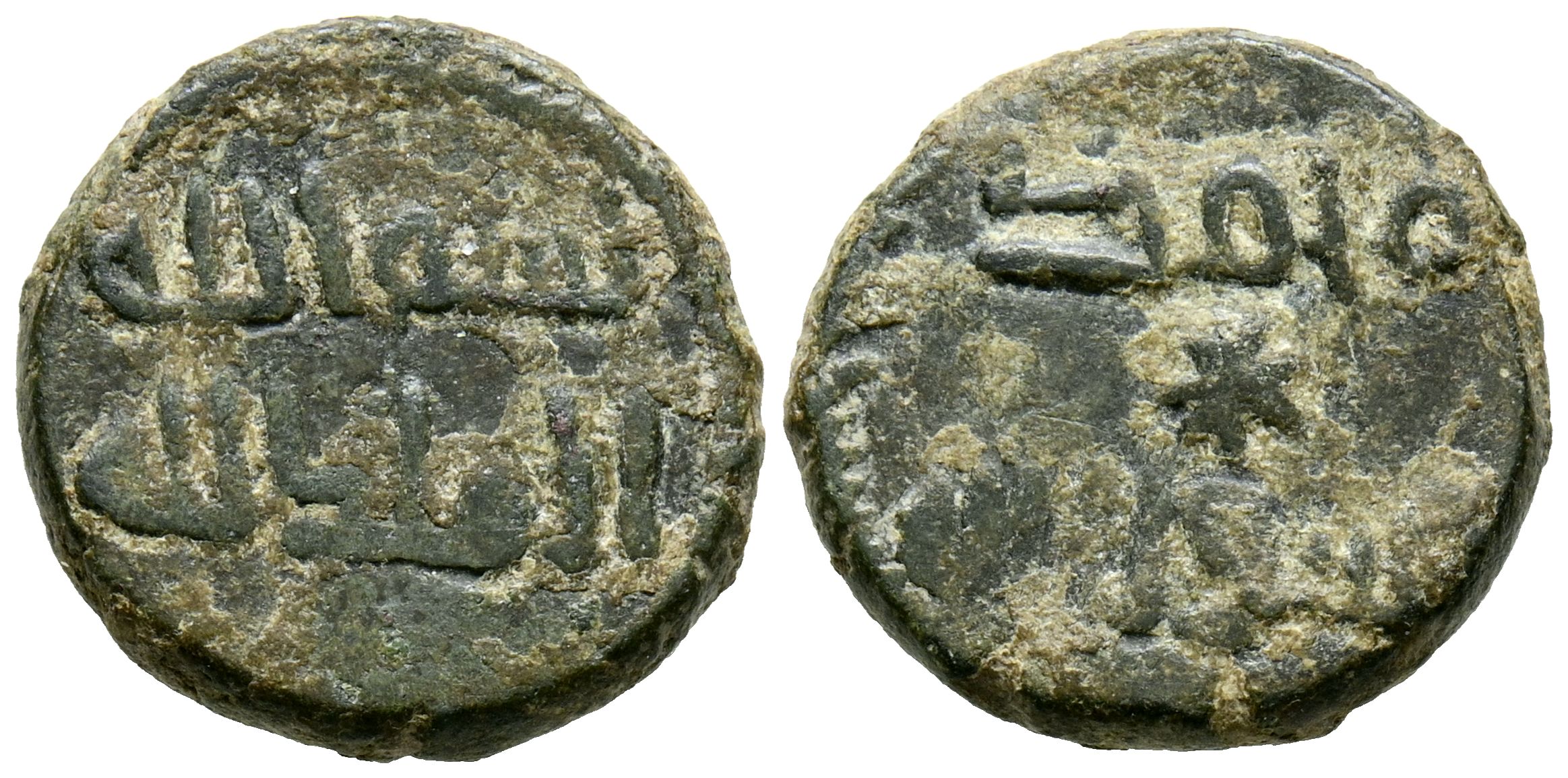 EMIRATO DEPENDIENTE DE CÓRDOBA, PERIODO GOBERNADORES. Anónimo. Felús. (Ae. 3,60g/16mm). S/D. (Frochoso X-a). Anv: الملك الله / بسم الله (En el nombre de Dios/ el reino de Dios). Rev: سواالله / محمدر (Muhammad enviado de Dios) estrella entre líneas. MBC.
