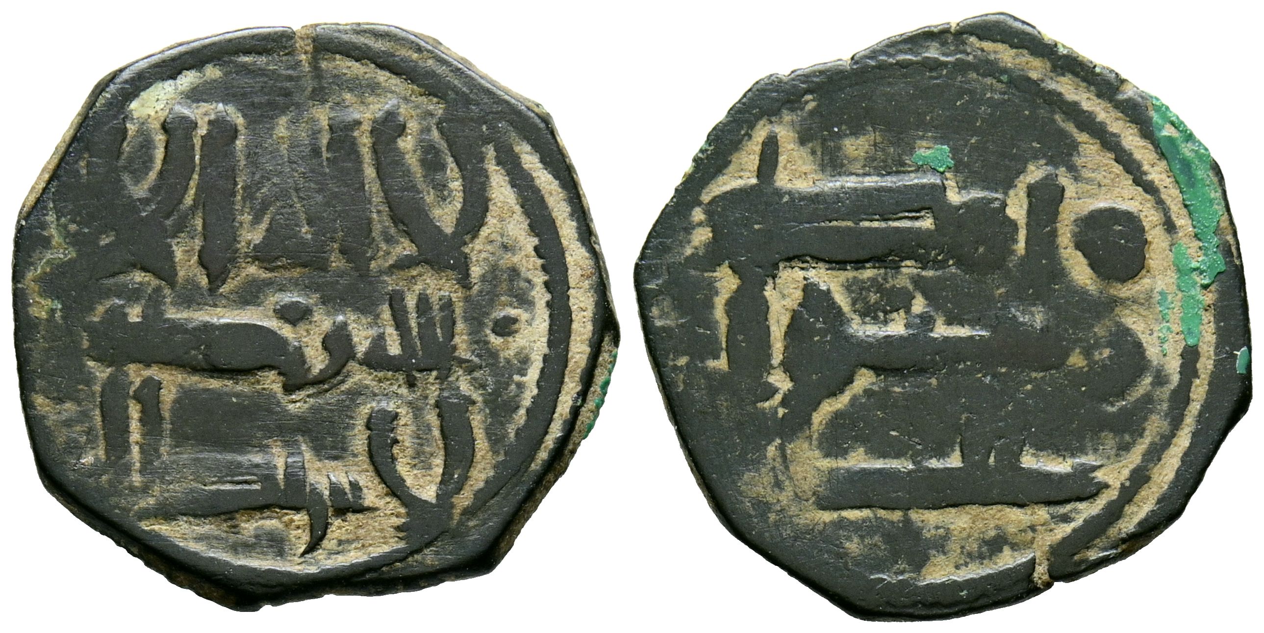 EMIRATO INDEPENDIENTE DE CÓRDOBA. Anónimo, atribuído a Abd al-Rahman II. Felús. (Ae. 1,89g/17mm). S/D. (Frochoso I-2). Tres líneas de leyenda religiosa en ambas áreas. MBC. Cospel de forma octogonal.