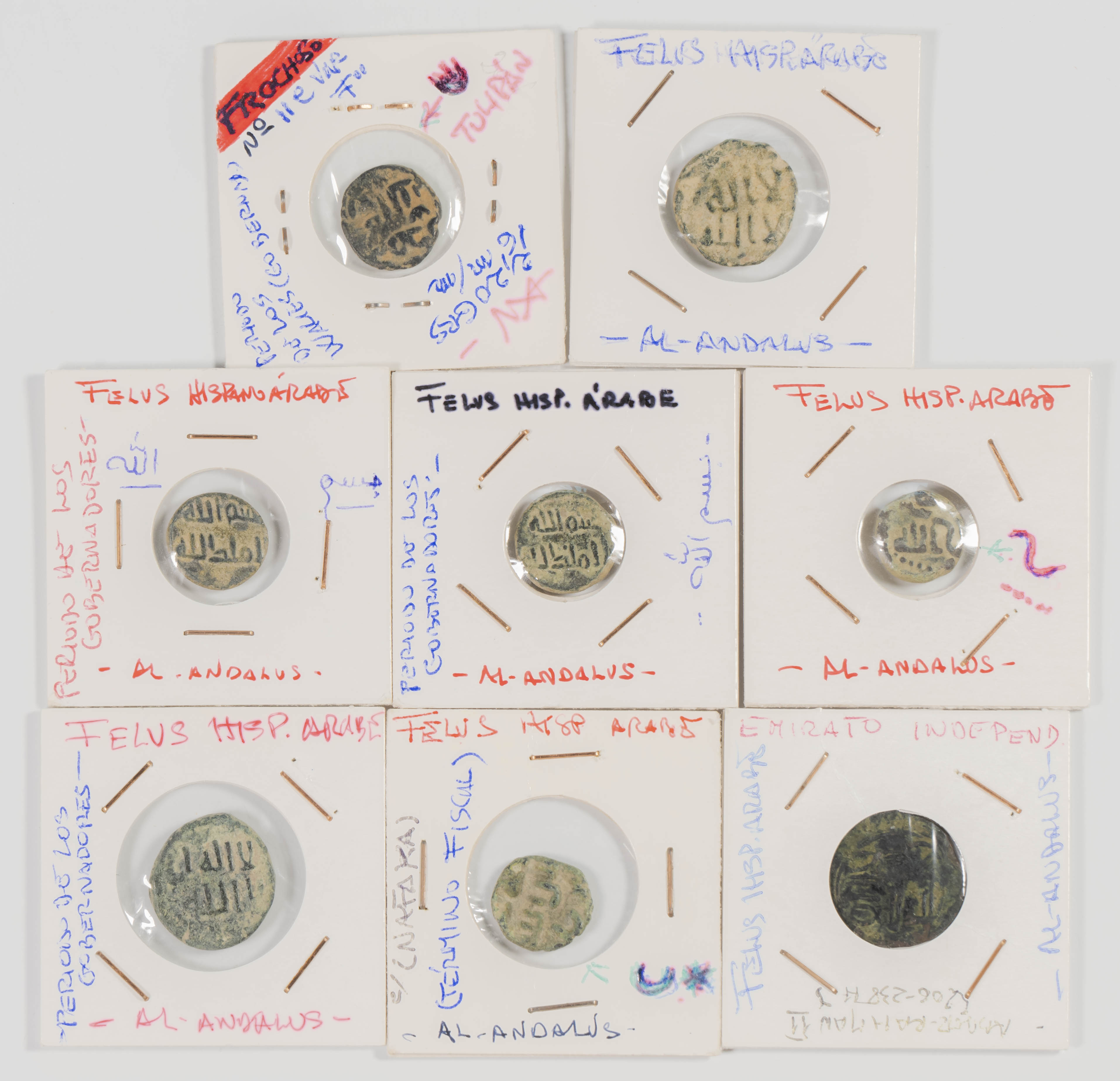 EMIRATO DEPENDIENTE DE CÓRDOBA. Interesantísimo conjunto formado por 8 félues, en su inmensa mayoría del primer periodo, incluyendo una pieza de las atribuídas a Abd al-Rahman II. Todos de diferentes tipologías o variantes. Diferentes medidas y estados de conservación. A EXAMINAR.