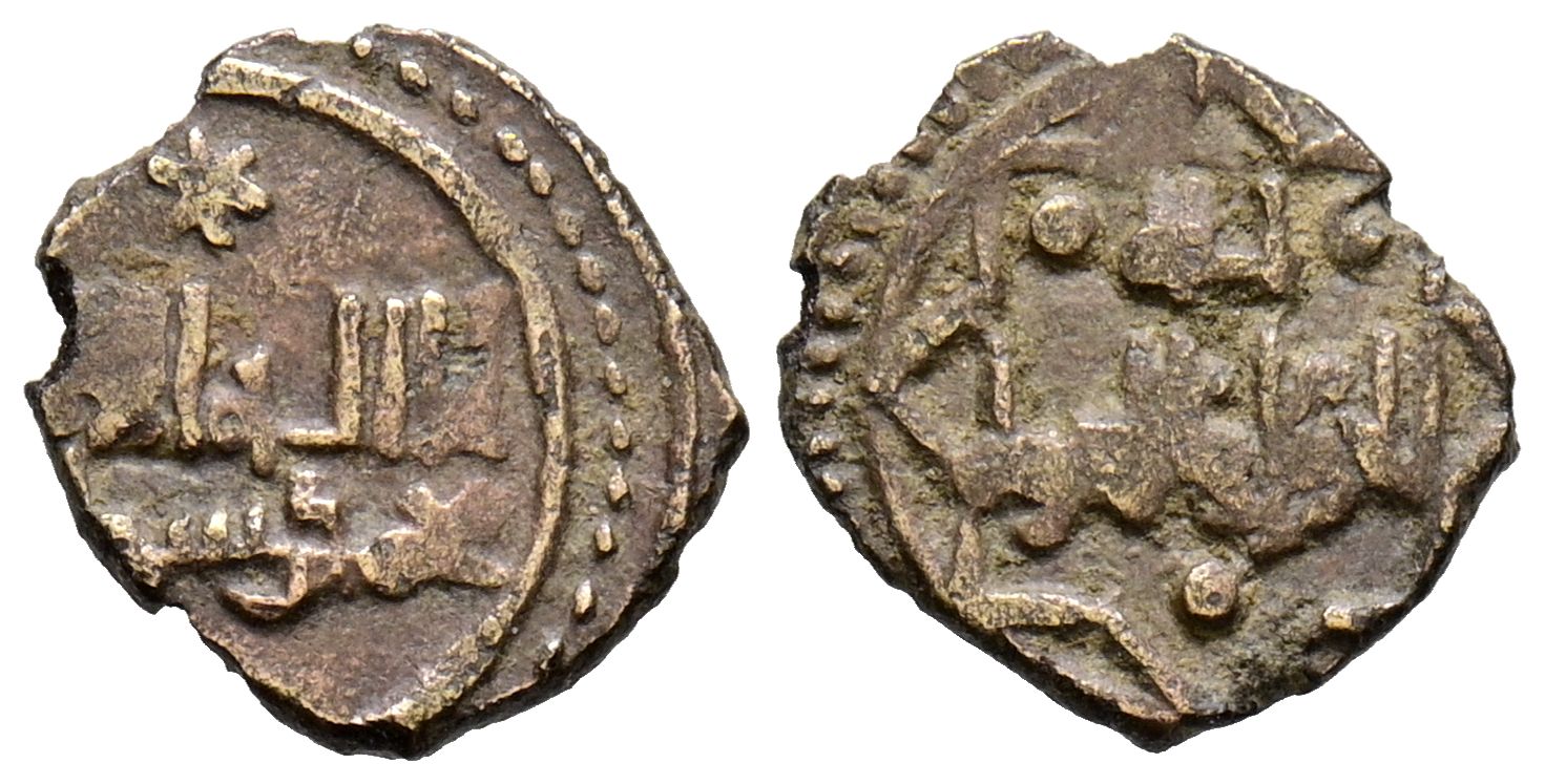 TAIFAS DEL CALIFATO, Anónimo atribuído a Toledo. Fracción de Dinar. (El. 0,38g/10mm). S/D. (Codera y Zaidin (1897) 1047 bis; Ibrahim, Cantó (2003) Suplemento a los Reinos de Taifas, nº 169, Francés nº362). Anv: لااله الاالله / محمدرسول الله. Rev: الحو ل و القوة / الله. (Para Dios / el poder y la fuerza). MBC. Escasa.Codera atribuyó esta pieza a Almería ''por tener alguna semejanza con algunos ejemplares del nº 1047 de Vives, aunque en el tesorillo donde aparecieron aquellos ejemplares, también contenía otros diferentes de las taifas de Toledo, Badajoz, Córdoba, Valéncia, Dénia y Zaragoza. Sin embargo, precediendo la intuición del doctor Albert Cantó, sería David Francés quien daría un razonamiento más lógico a su origen, en su libro ''De la legitimidad, las sucesiones y su reflejo en las acuñaciones andalusíes'' pág. 137-139, justificando la atribución de esta pieza a Toledo, durante la presencia de 'Umar al-Mutawakkil rey de Badajoz."