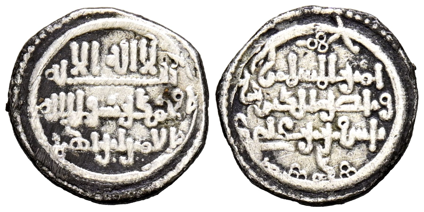 ALMORÁVIDES, Tashfin ben Ali con Ibrahim como heredero (539-540H). Quirate. (Ar. 0,82g/12mm). S/D. (Vives 1885; Hazard 1035; Benito Db2). Anv: 'Shahada' en tres líneas y mención al heredero. Rev: Presenta a Tashfin con títulos de Amir al-Muslimin y Nasir al-Din. MBC.