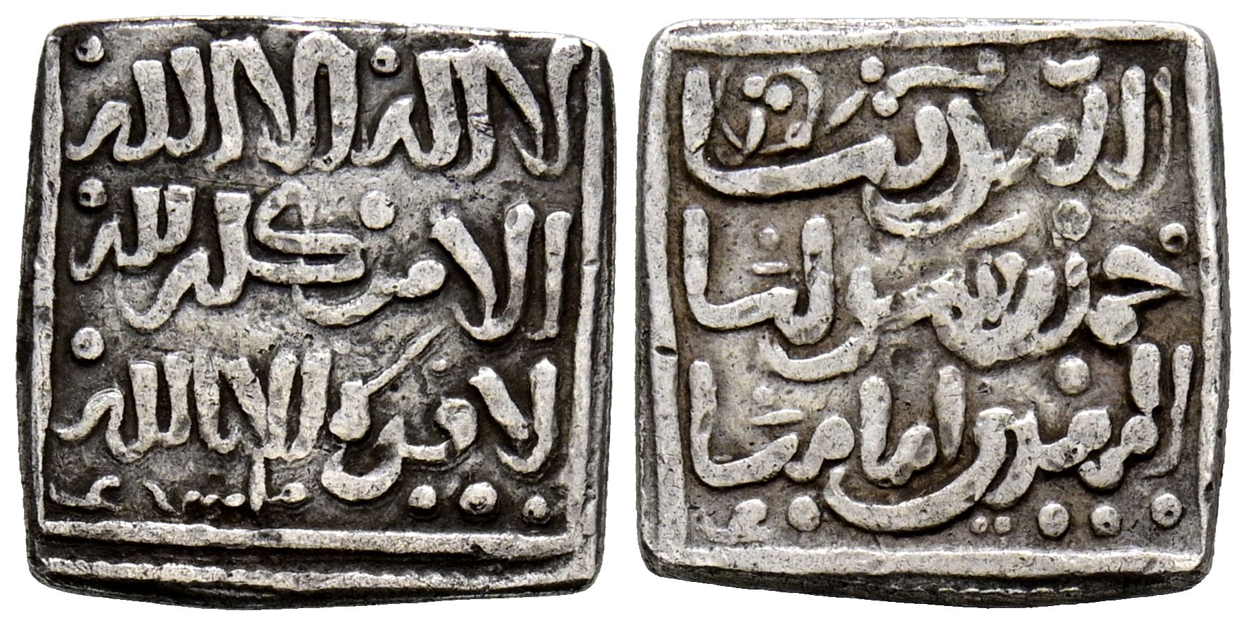 ALMOHADES. Anónimo a nombre del imán Al-Mahdi. Dirham, copia africana de época. (Ar. 1,17g/12mm). Fez / فاس. (Tipos: Vives 2107 y Hohertz 601b). MBC. Alabeada. Interesante pieza para estudio.Singularmente, además de los típicos roeles esta pieza contiene en la esquina inferior izquierda de ambas áreas, un diminuto adorno en forma de ''ʿayn'' inicial y que posiblemente se trate de una marca de conteo.