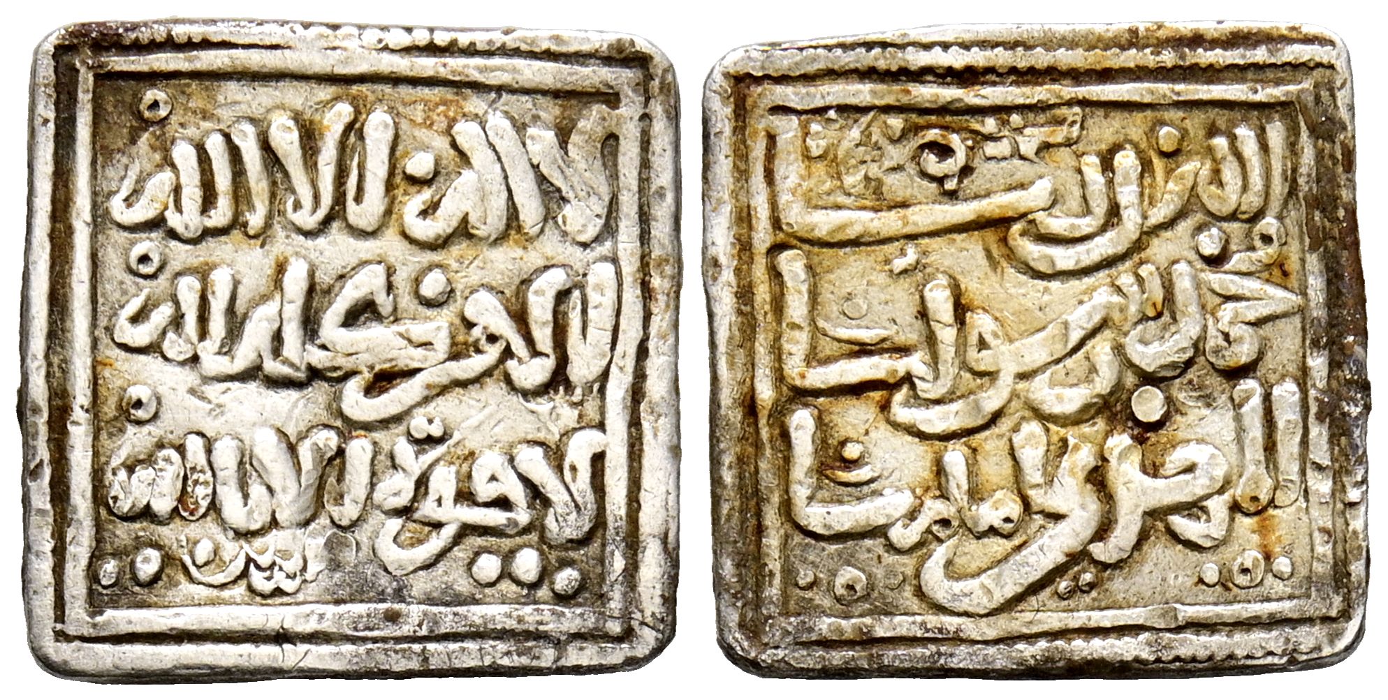 ALMOHADES. Millarés. (Ar. 1,24g/14mm). Siglo XIII. Imitación cristiana de un dirham almoháde a nombre de Al-Mahdi. (Medina 201-bis; Hohertz 651var). Letra 'Sin' aislada en lugar de la ceca, con decoración de tres puntos en ambas áreas. MBC+. Interesante ejemplar.