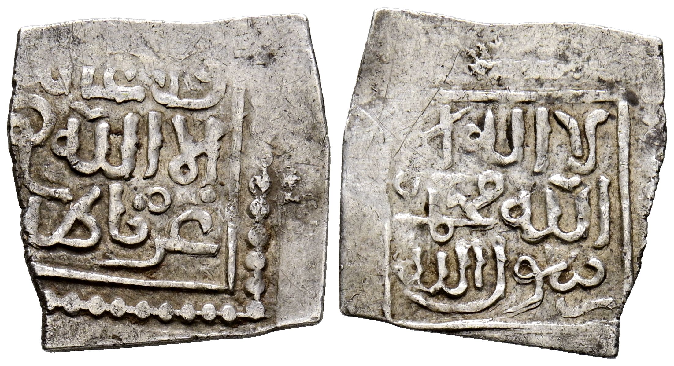NAZARIES DE GRANADA, Anónimo. 1/2 Dirham. (Ar. 0,86g/16mm). Granada / غرناطة. (Vives 2191; Medina 266.a, Hohertz2017-747). Con “ta”, abreviatura de la palabra ta’ālà / تعالى que significa “ensalzado sea”. MBC+.