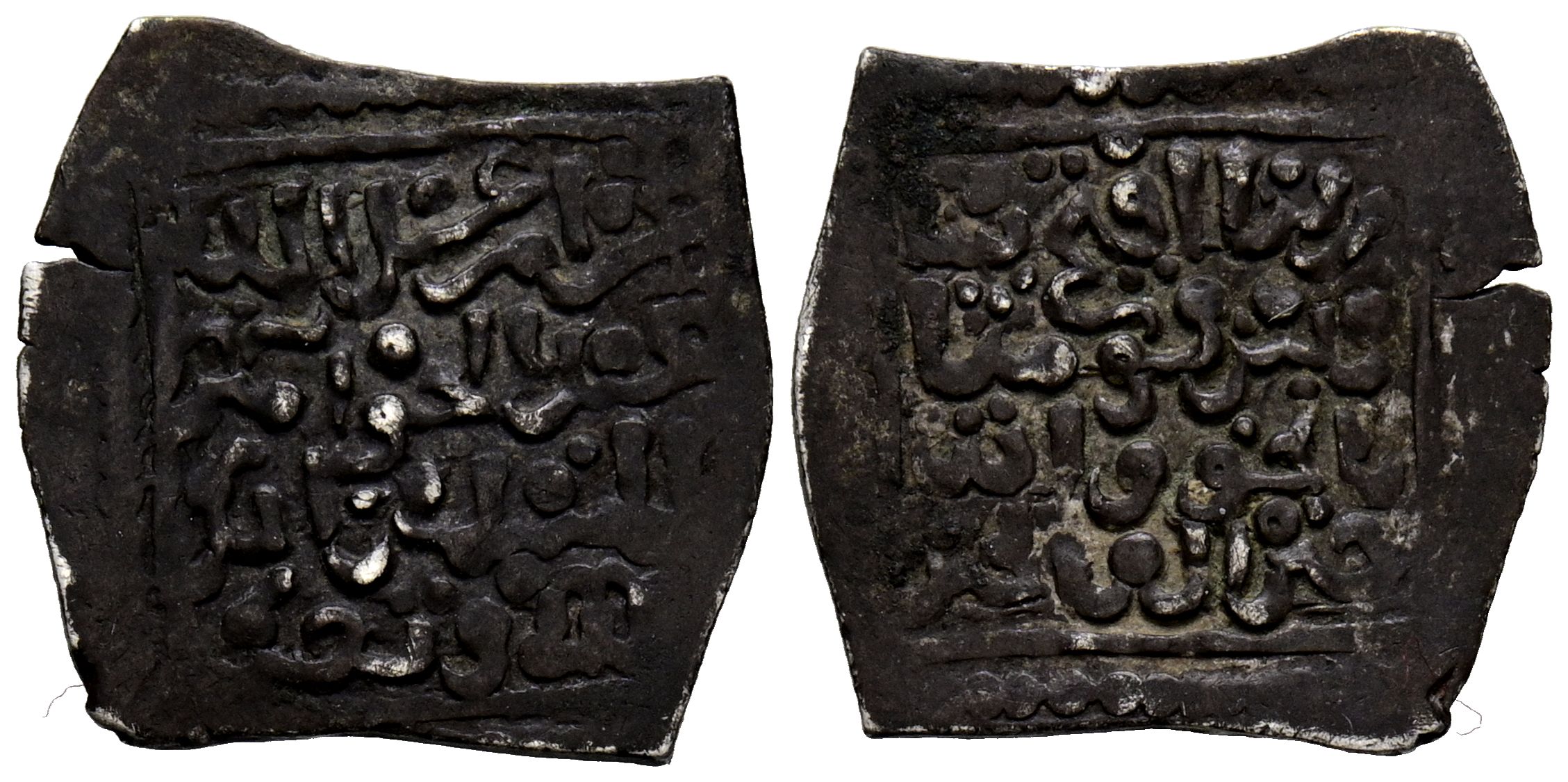 MERINÍES. 'Abd Al-Haqq II. 1/2 Dirham. (Ar. 0,82g/15mm). 823-869H. Sin ceca. (Hohertz 829, marcado como RR). Anv: Sura Al-A'raf, versículo 89. Rev: Presenta al sultan 'Abd Al-Haqq / عبد الحق, con título de amir al-Muslimín. MBC. Pátina oscura. Rara.