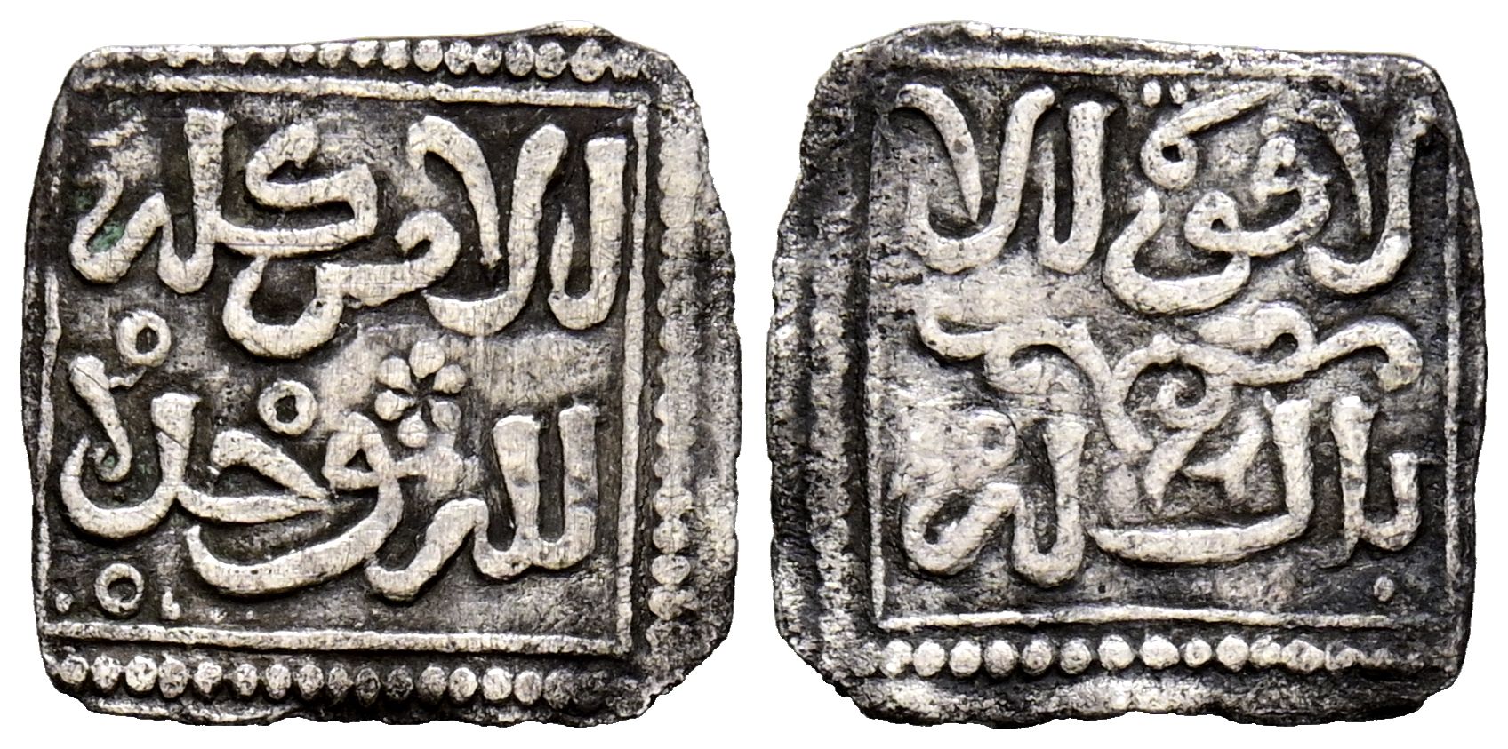 MERINÍES. Anónima. 1/3 Dirham. (Ar. 0,40g/11mm). Sin ceca. (Hohertz 853). Anv: لا قوة الا / بالله. Rev: الأمر كله / لله وحده. MBC+. Raro ejemplar.