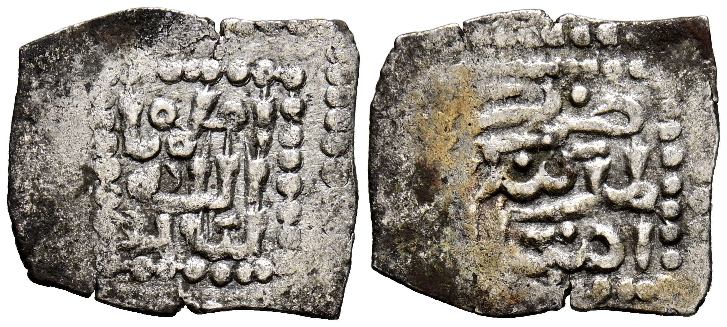 MERINÍES. Anonimo. 1/2 Dirham. (Ar. 0,80g/16mm). 823-869H. Madinat Asilah / بمدينة اصيلا. (Hohertz 881, marcado como RR). Anv: Nuestro líder es / Dios/ Enaltecido sea. Rev: Acuñado / Madinat / Asilah. MBC. Pátina oscura. Rara.