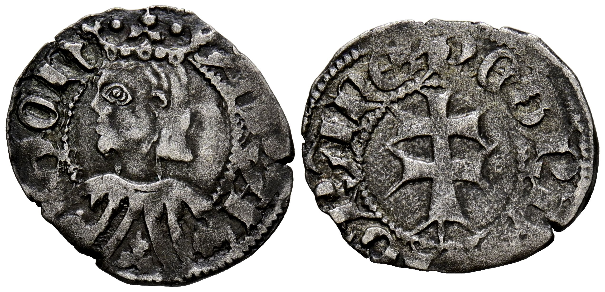 PEDRO IV (1336-1387). Dinero. (Ve. 1,01g/19mm). Aragón. (Cru VS 463). Anv: Busto coronado de Pedro IV a izquierda dentro de de grafila circular, alrededor leyenda: ARAGON. Rev: Cruz patriarcal dentro de grafila circular, alrededor leyenda: PETRVS DI GRA REX. MBC-.