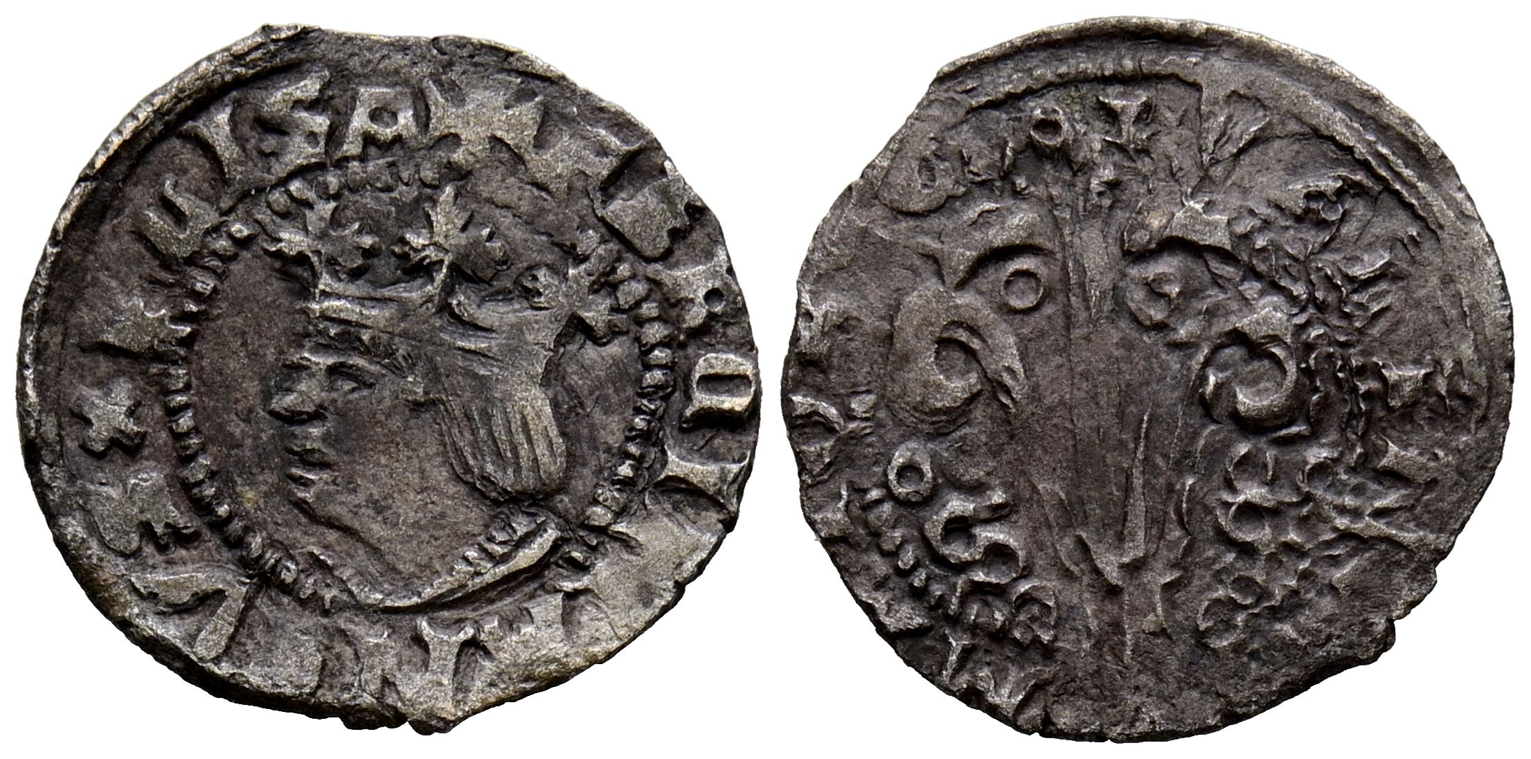 FERNANDO II (1479-1516). Dinero. (Ve. 0,74g/15mm). Valencia. (Cru. V.S. 1215). Anv: Busto coronado de Fernando II, alrededor leyenda: FERNANDVS ELISAB. Rev: Arbol superado por cruz entre S-S, alrededor leyenda: VALENCIE-MAIORCA. MBC-.