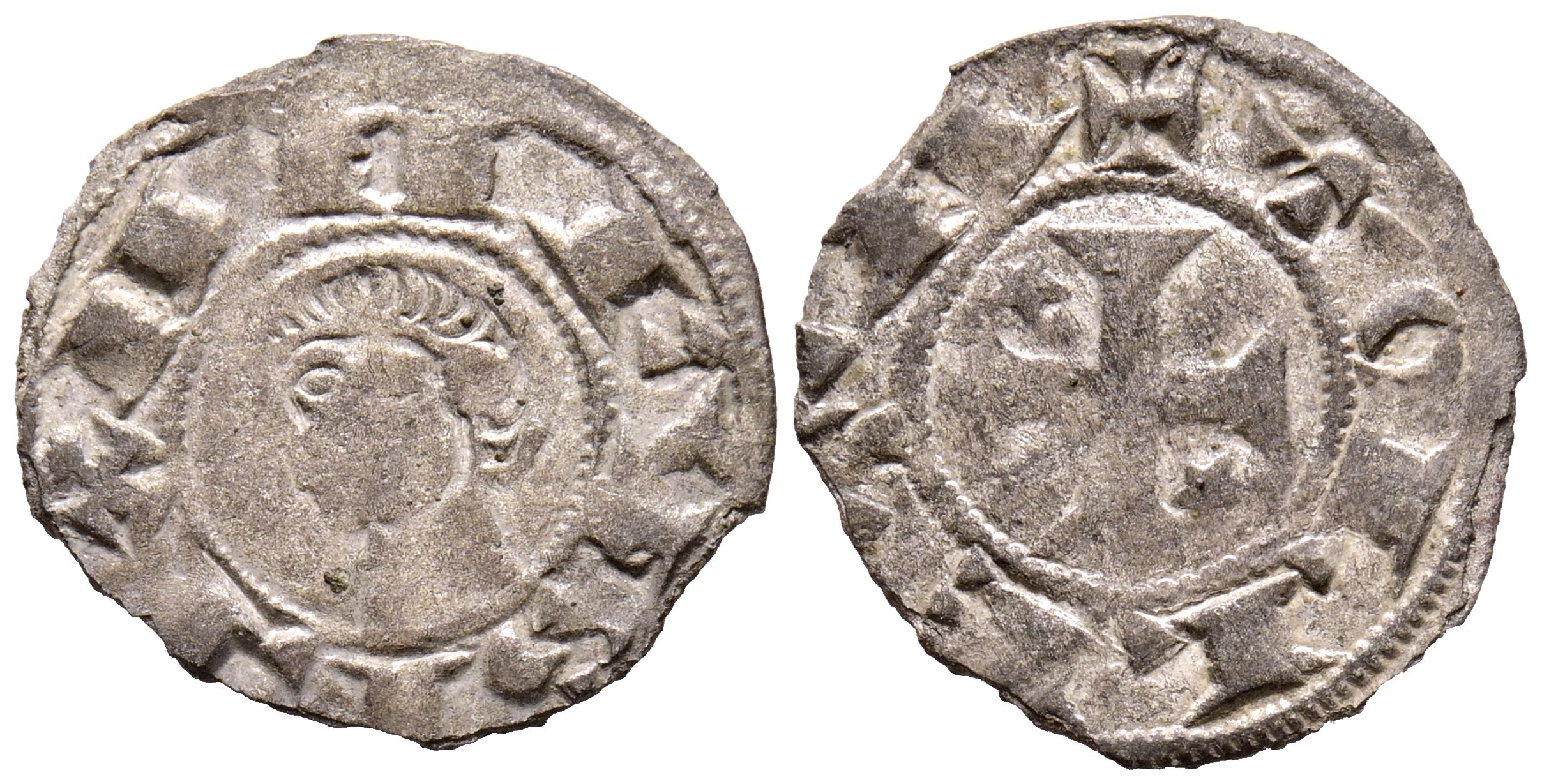 ALFONSO VIII (1158-1214). Dinero. (Ve. 0,74g/17mm). Taller itinerante de batalla. (Imperatrix A8:28.1; FAB-23 como Alfonso I de Aragón). Anv: Busto a izquierda dentro de gráfilar circular, alrededor leyenda: ANFVS REX. Rev: Cruz patada con roel estrellado en primer y cuarto cuadrante, todo dentro de una gráfila circular, alrededor leyenda: TOLLETA. MBC-. Canto faltado.